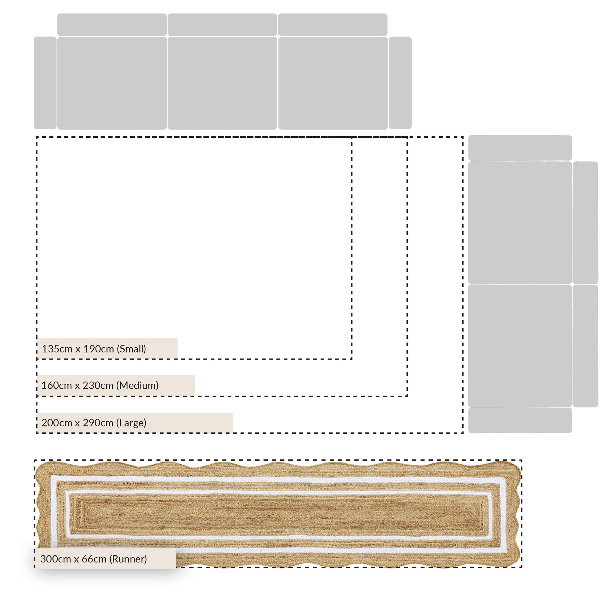 • Evie’s design is complemented by the classic scalloped edge and a bleached double white border to add contrast to the natural jute