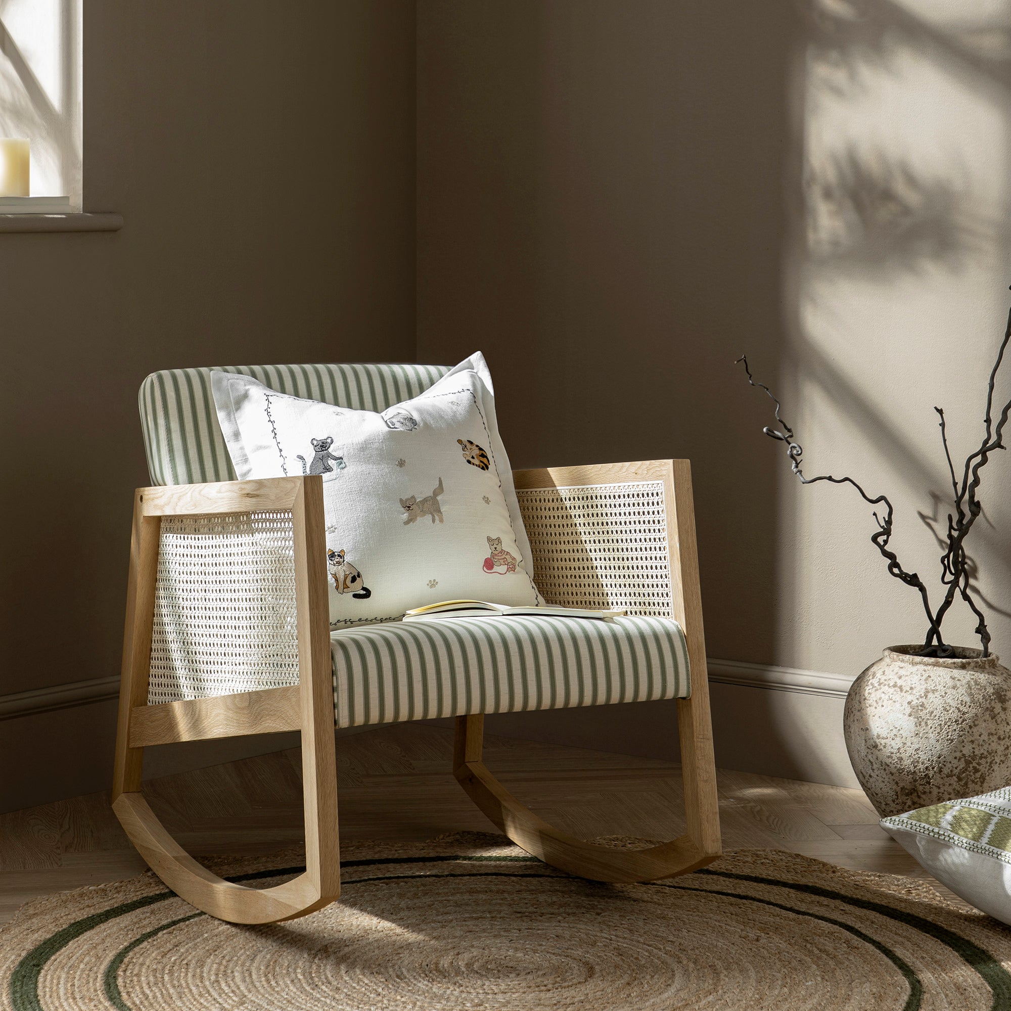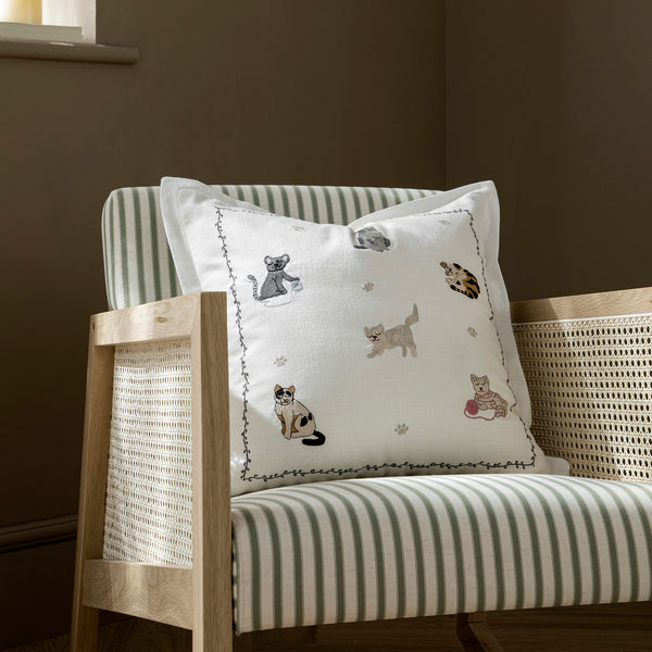 - Complete the look: Pictured with the Whimsical Animals Feline Fine Cushion is our Fyne Sage Striped Linen Blend Natural Oak Armchair with Rattan Armrests.