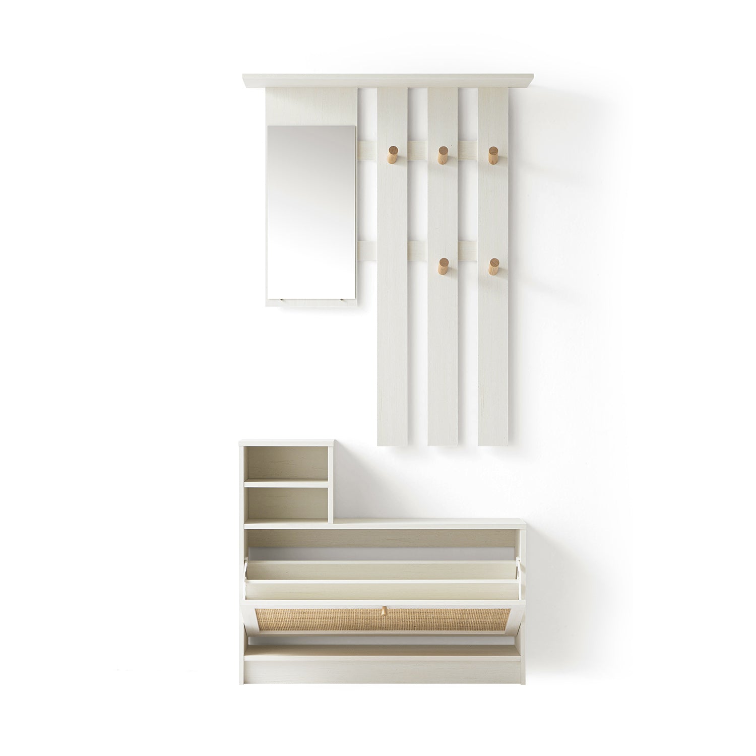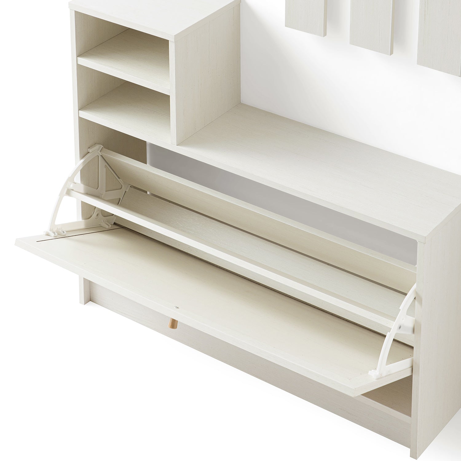 - Below, the coordinating shoe cabinet offers storage behind a fold-down front, keeping footwear neatly organised.