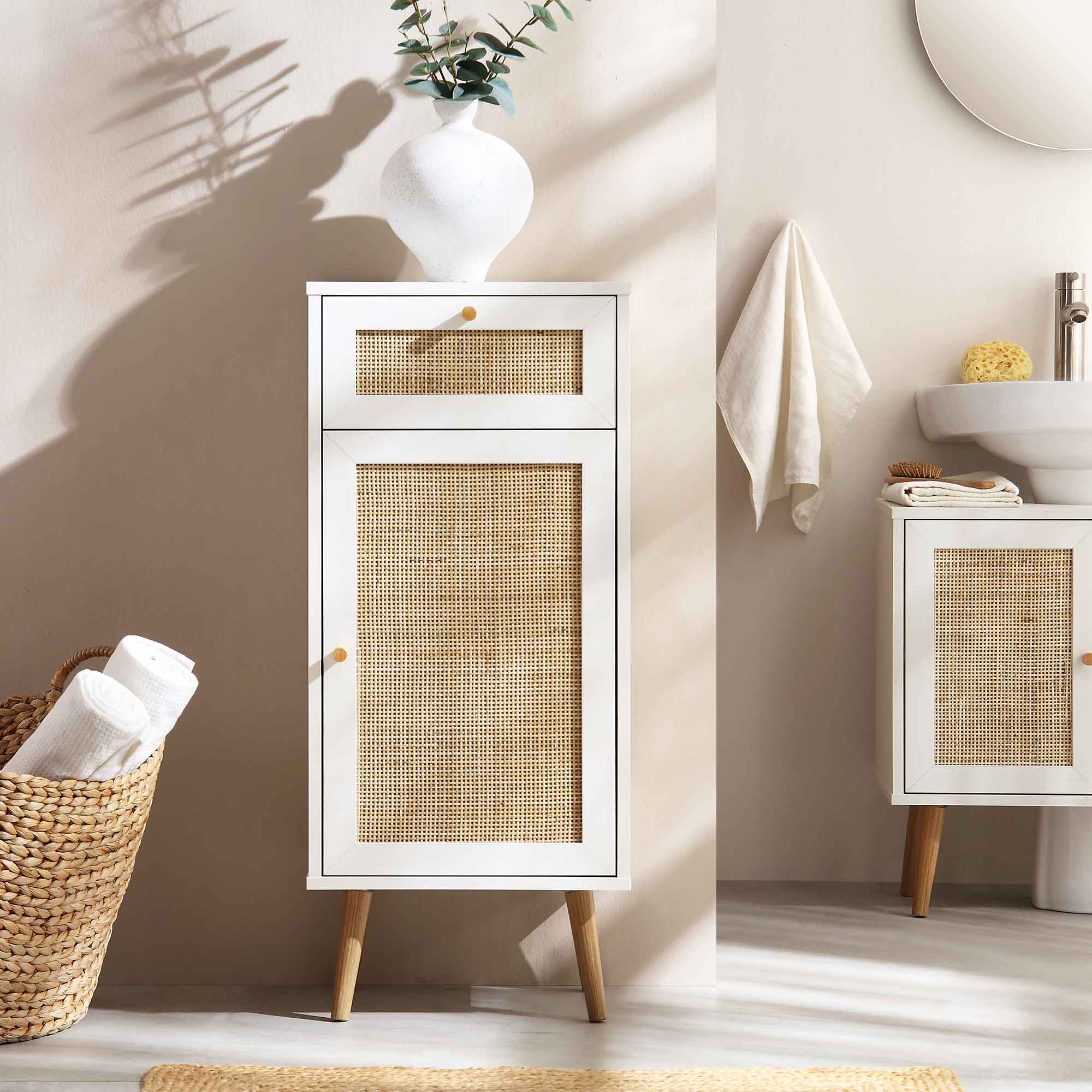 Complete the look: Pictured with our Frances Woven Rattan 1-Door Bathroom Cabinet is our matching Frances Woven Rattan 2-Door Undersink Unit in White