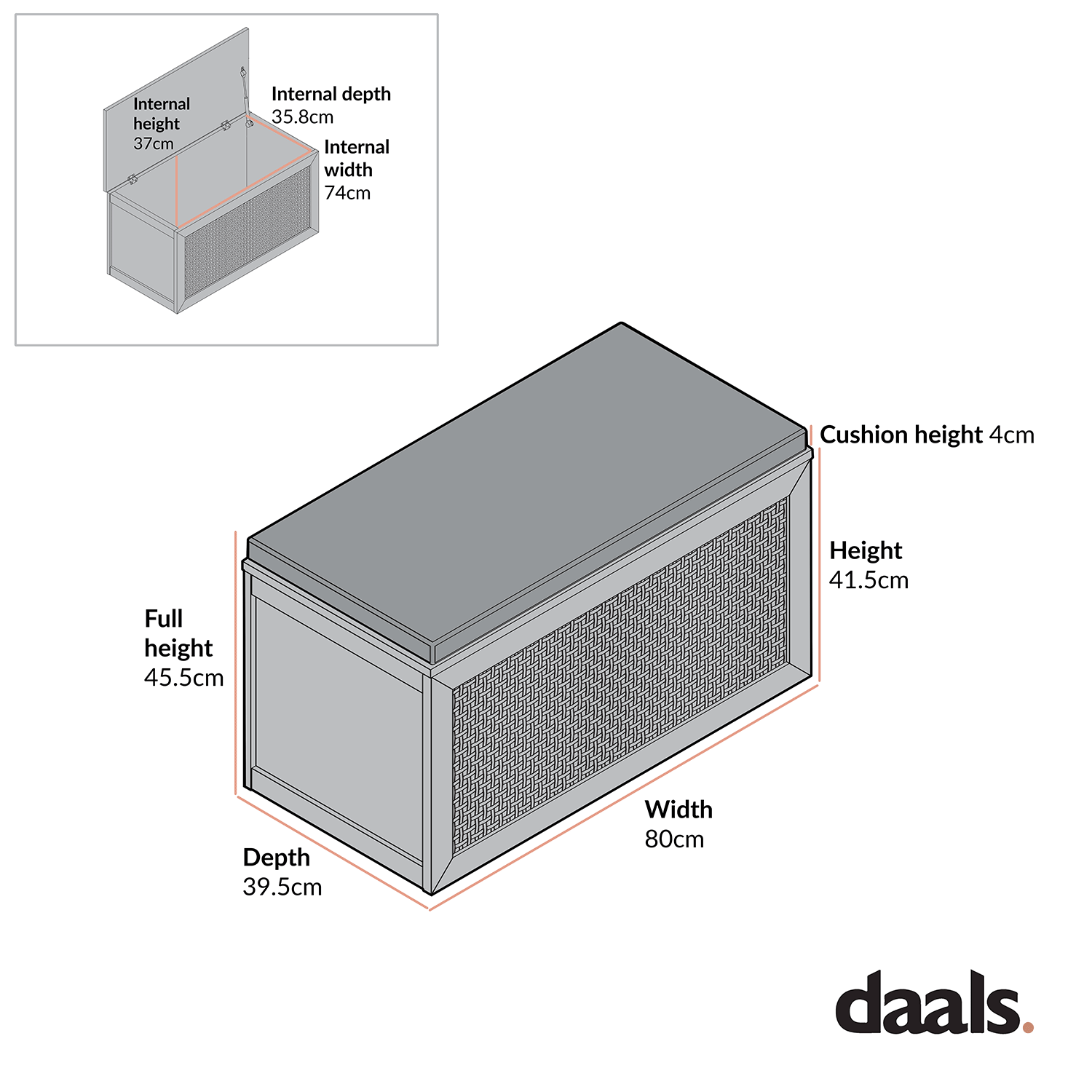 - Internal storage space: W 74 x D 35.8 x H 37 cm