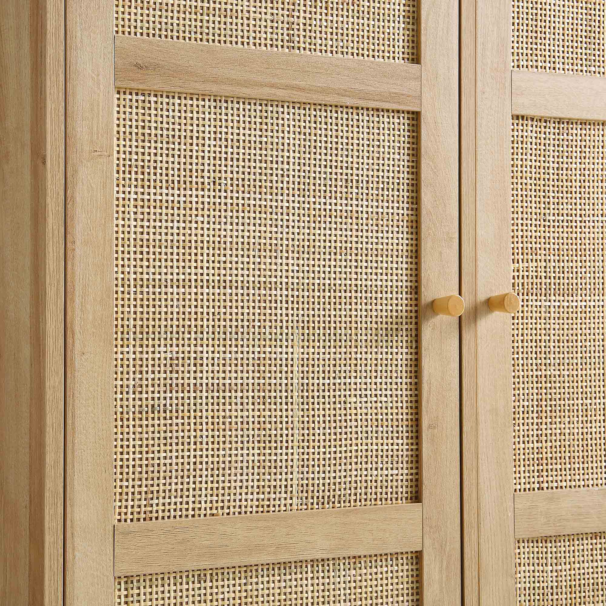 - Hand woven natural rattan on the wardrobe doors coordinate with solid wood door handles.