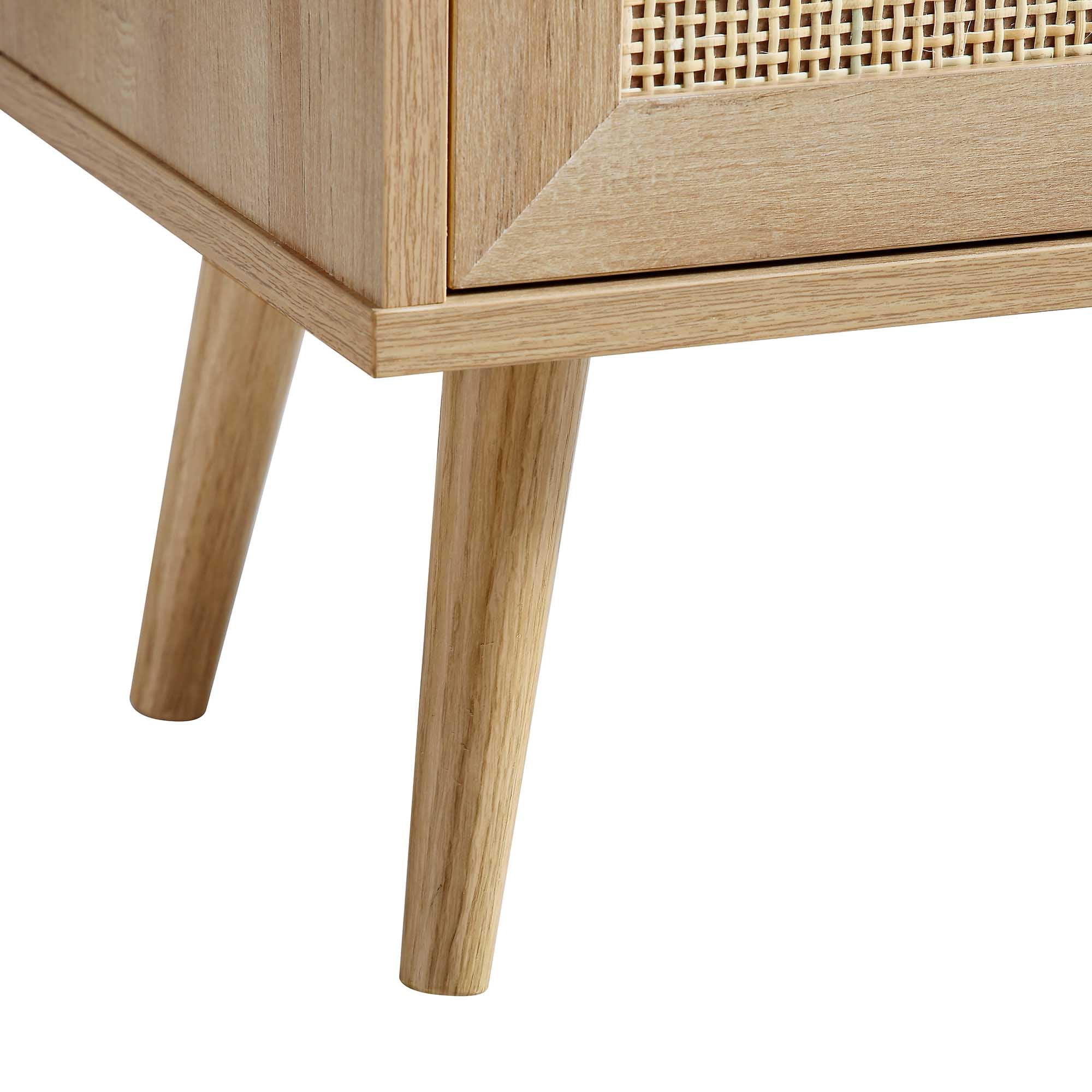 - The rattan doors and drawer are completed with a solid wood handle, adding to the minimalist nature of the unit
