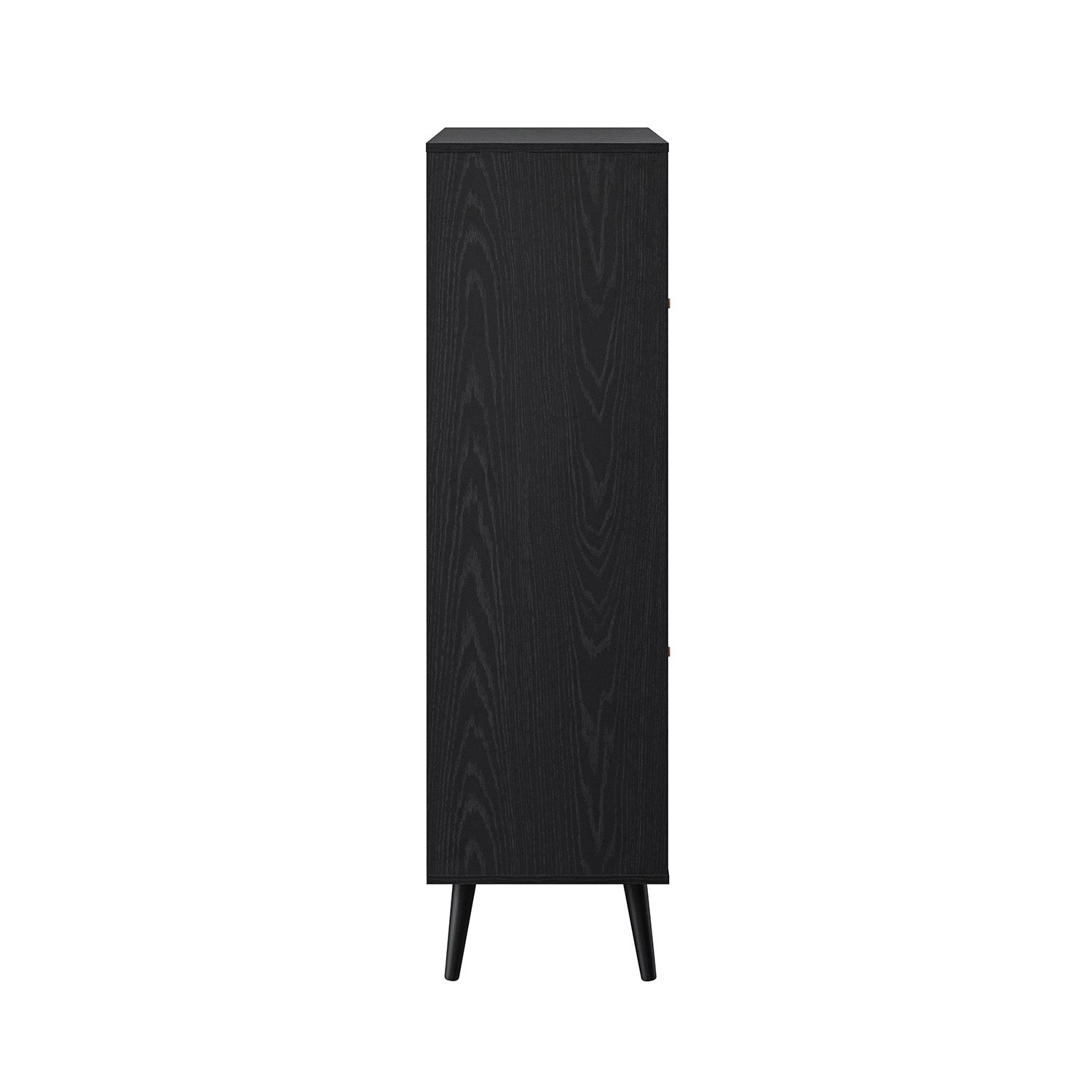 - Finished in ebonised wooden effect veneer and softened with woven rattan detailing, it balances confident form with natural texture.