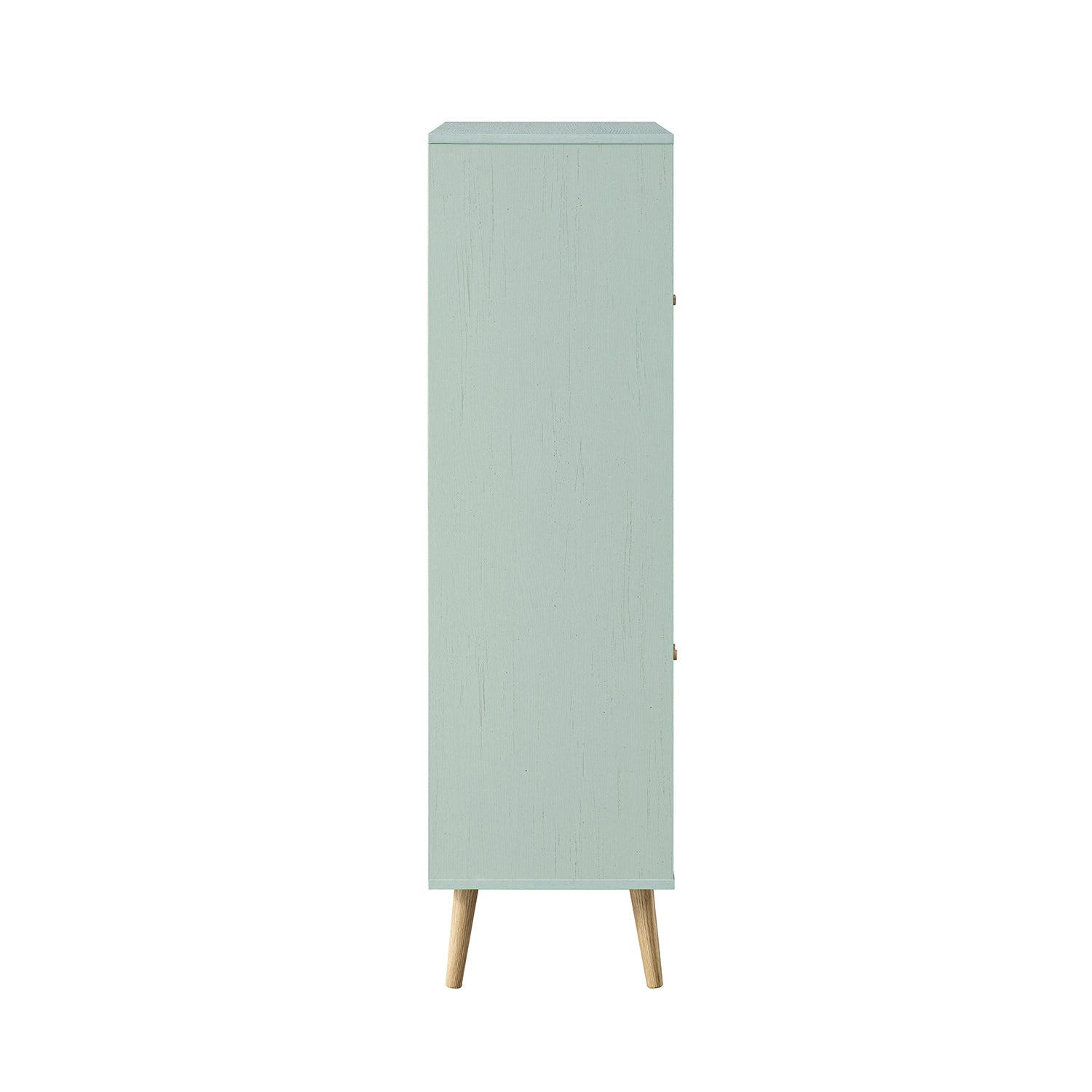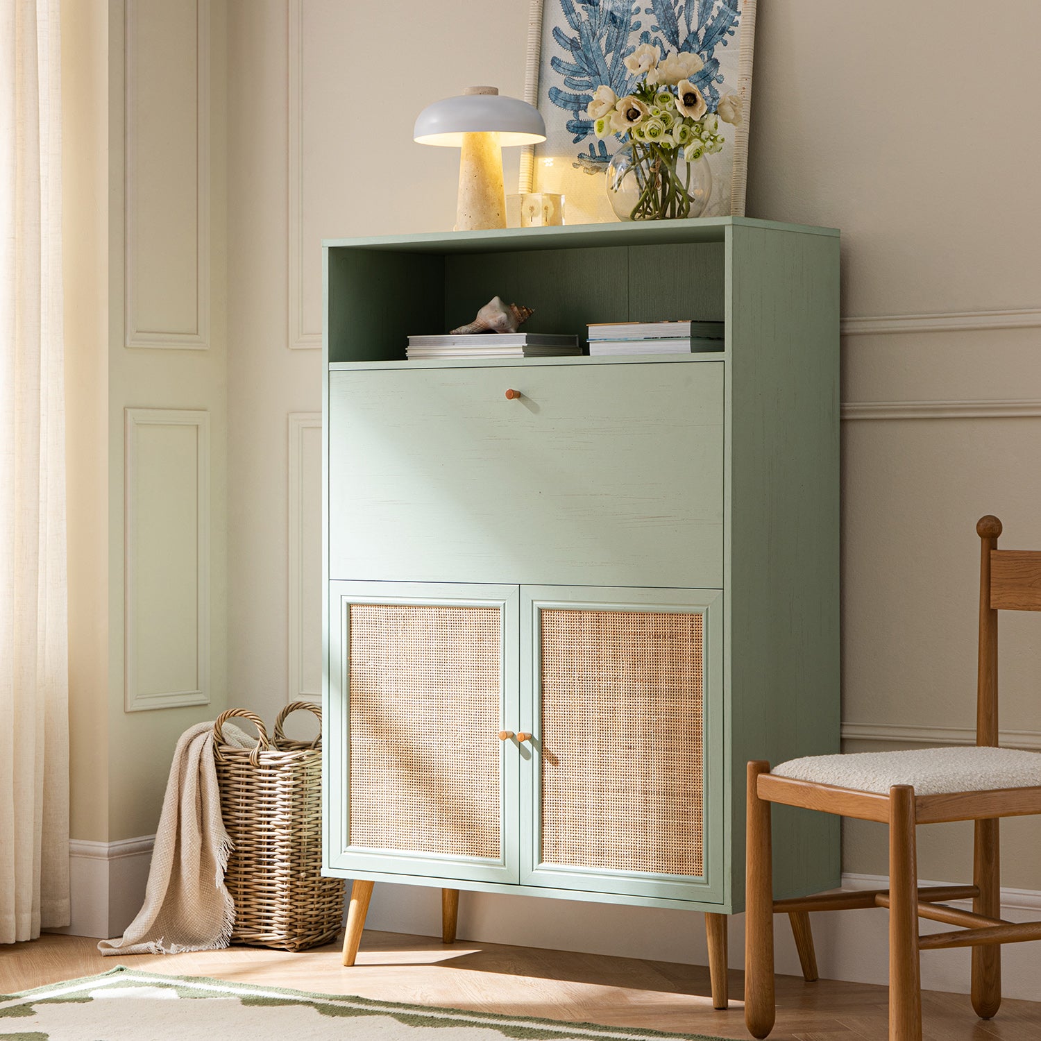 - The muted mint finish is balanced with natural woven rattan detailing, creating a light, relaxed look that feels distinctive yet timeless.