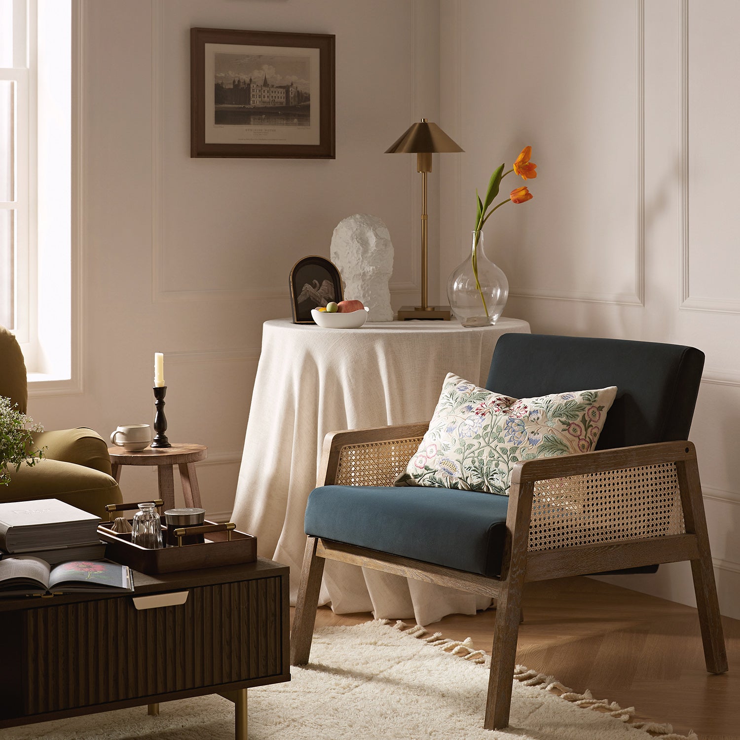 Fyne Aegean Blue Velvet Weathered Oak Frame Rattan Armchair