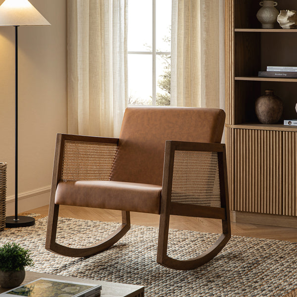Fyne Tan Faux Leather Rocking Light Walnut Armchair with Rattan Armrests