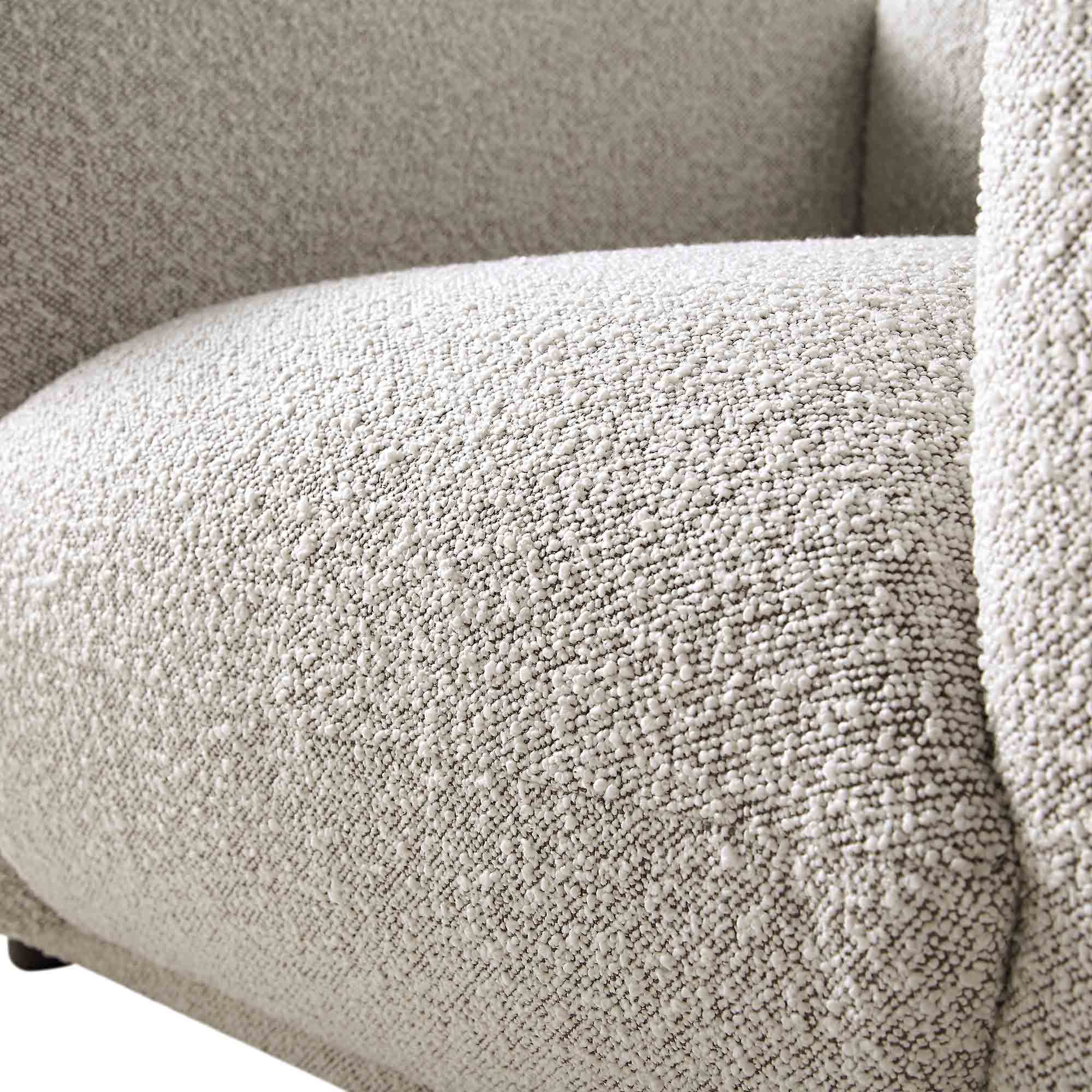 - Upholstered with chic mist grey boucle fabric for a contemporary look.