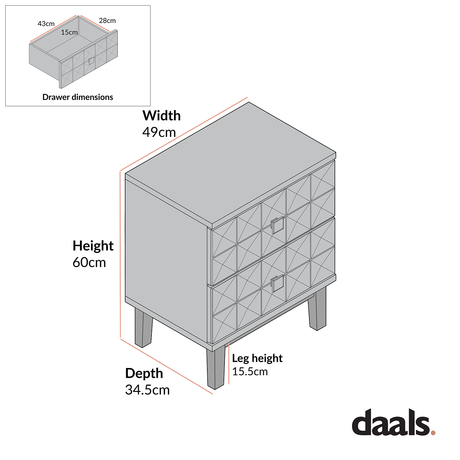 - Drawer internal storage size: W 43 x D 28 x H 15 cm