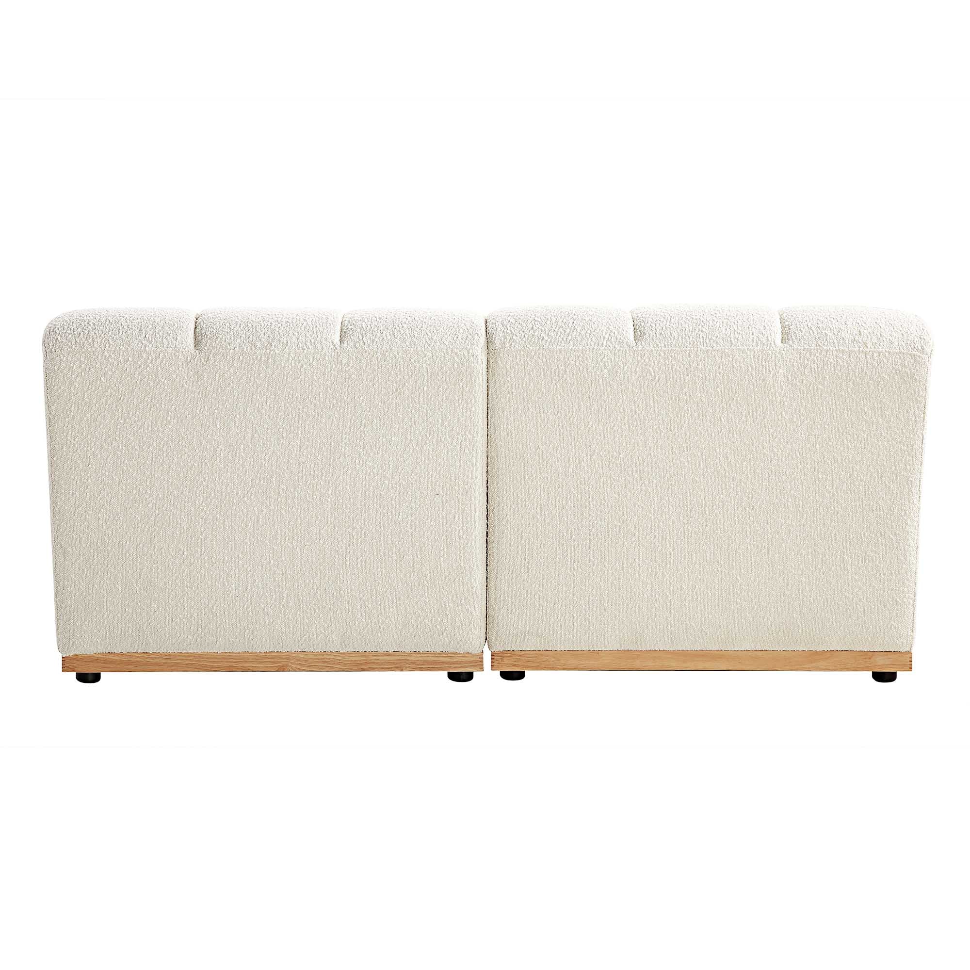 - Upholstered with beautiful ecru boucle fabric, the sofa modules are mounted on natural solid wood bases.