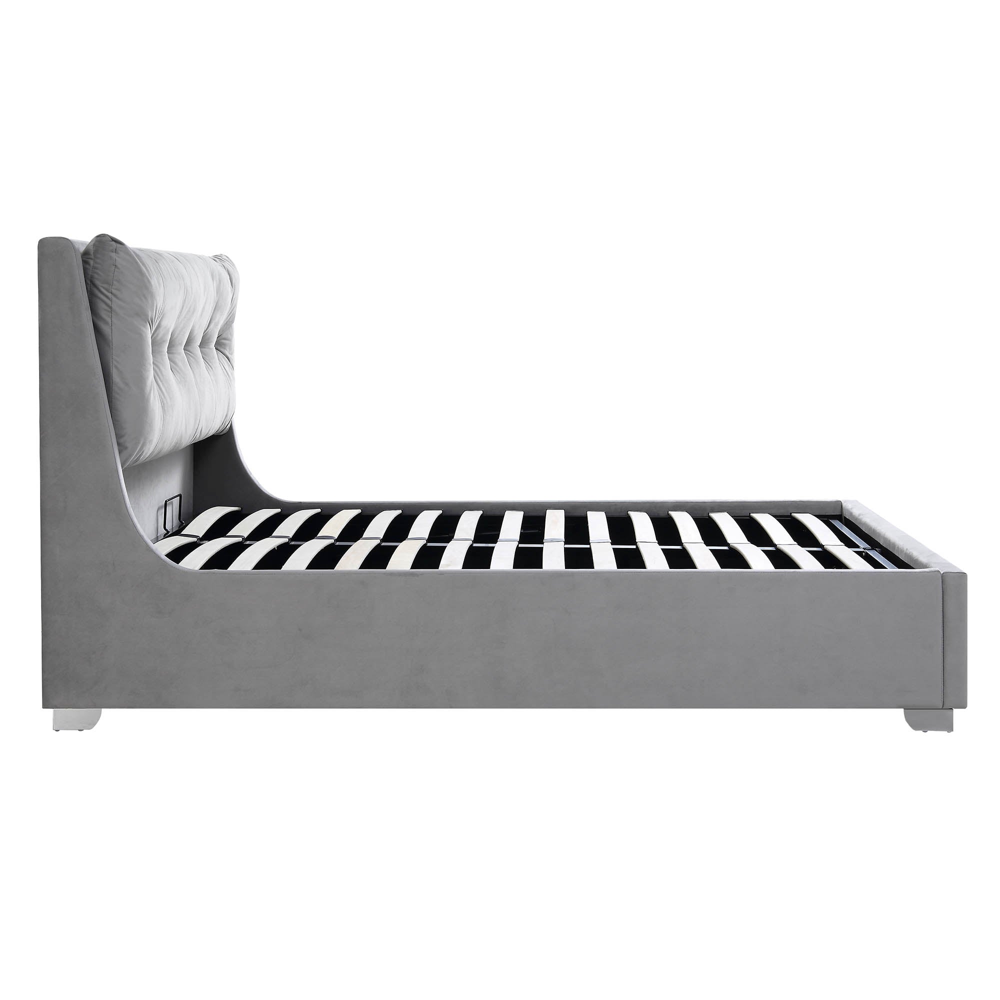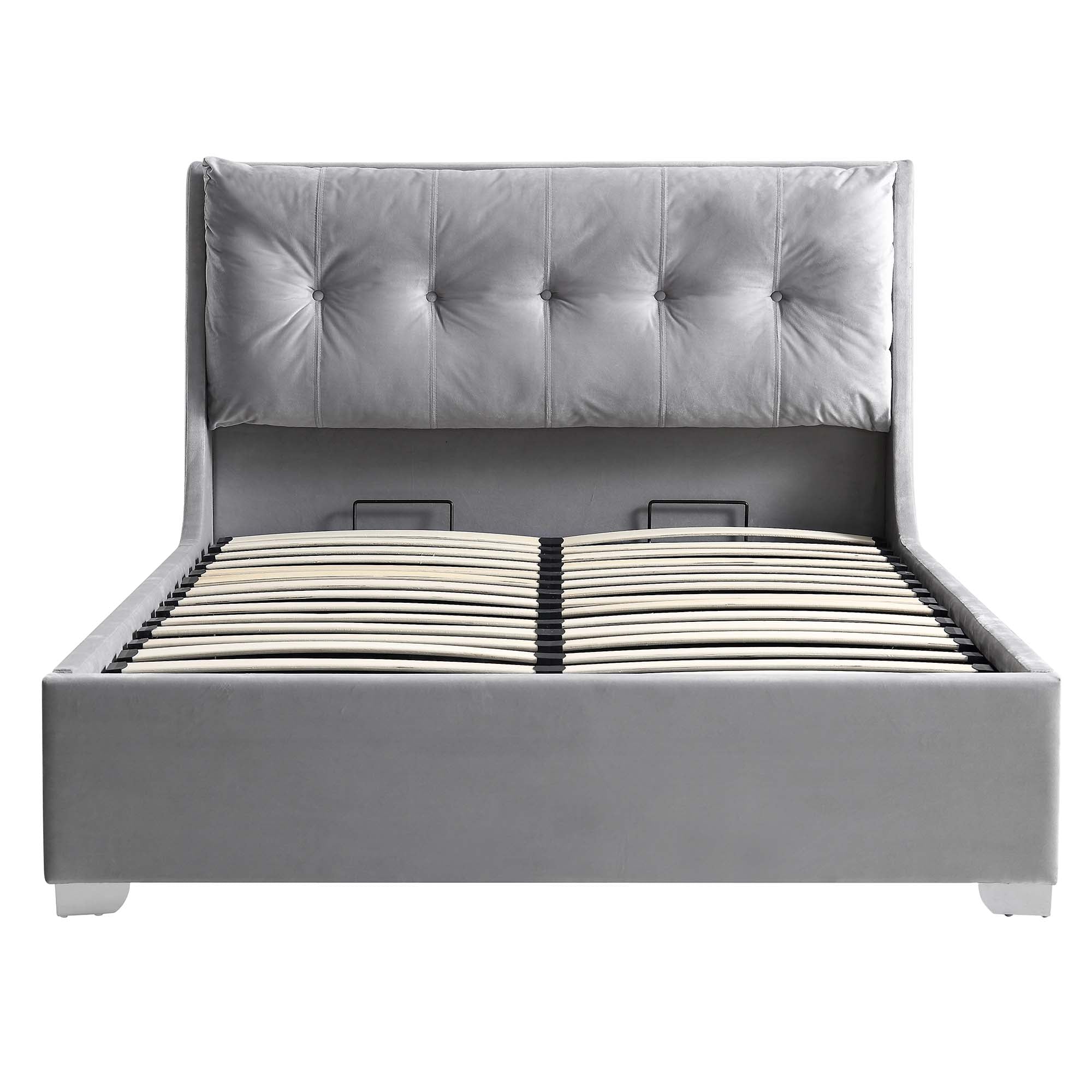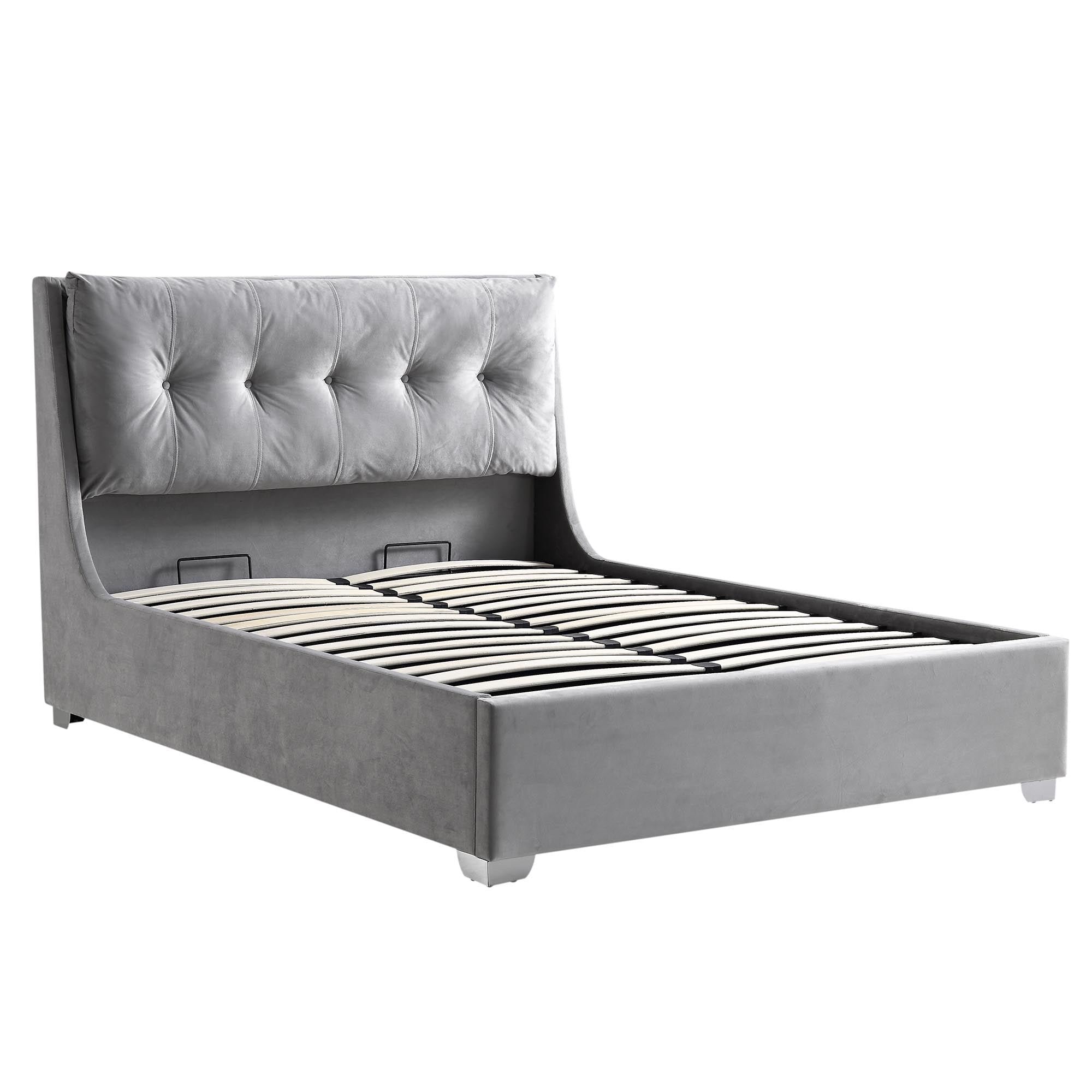 - Upholstered with soft velvet touch fabric in light grey colour (that can never go wrong), the bed sits chrome corner feet for a modern glam look.
