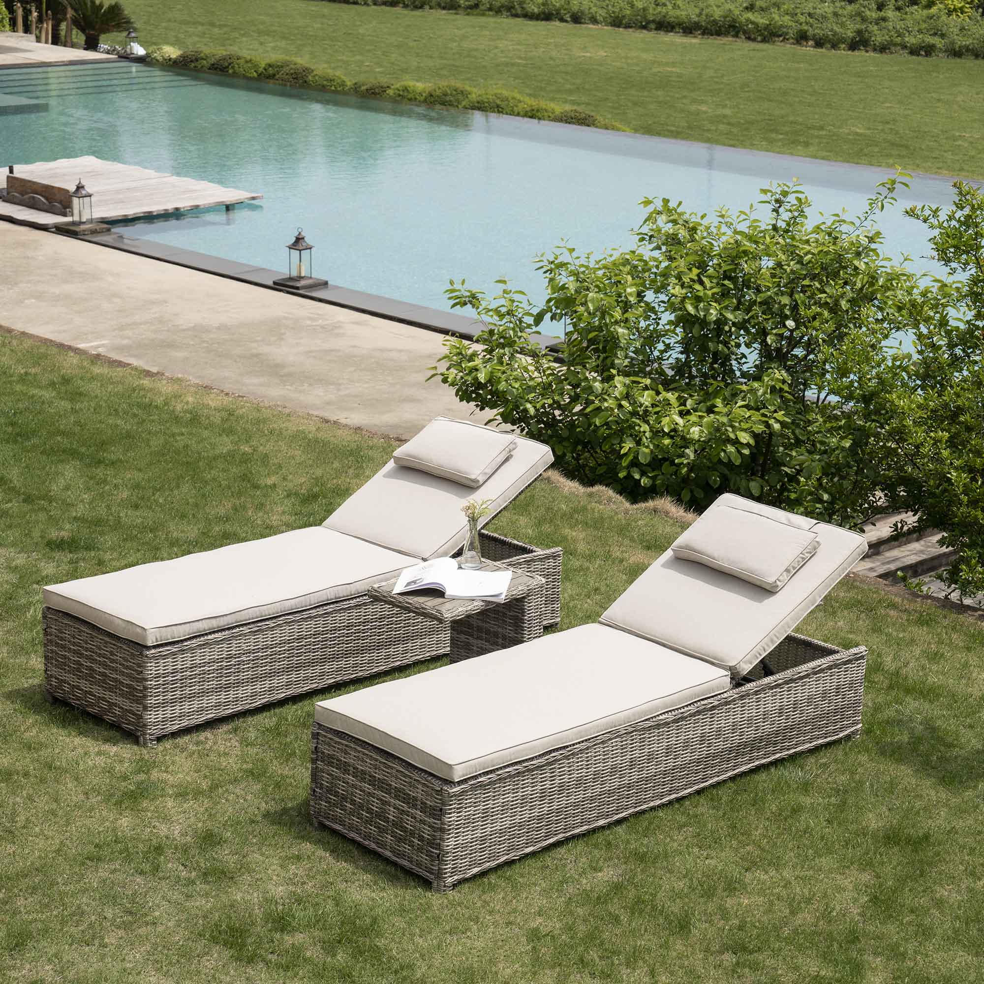 - The set comprises of two reclining sun loungers and matching C-shaped side table