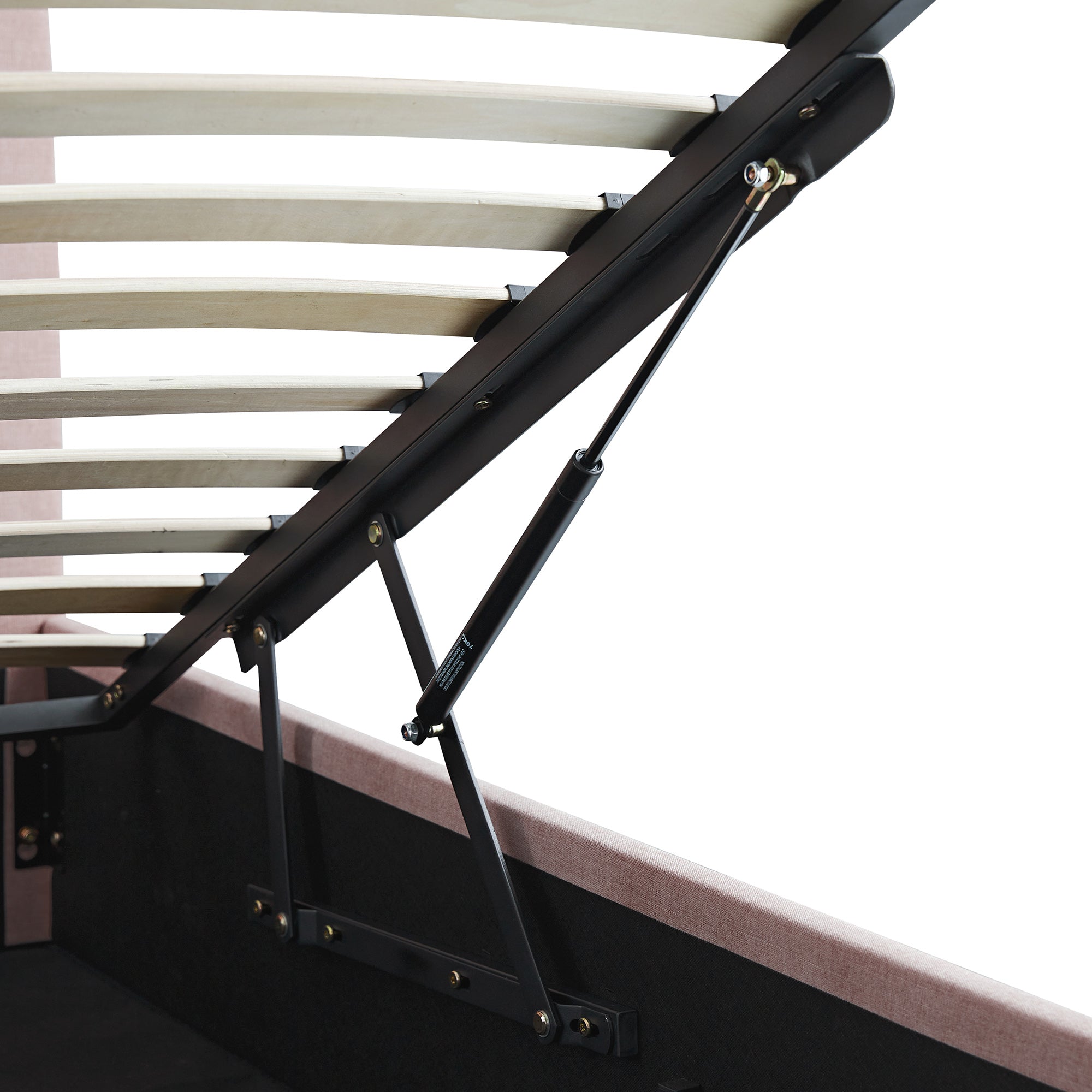 - The neatly upholstered base conceals an ottoman compartment, accessed from bed end with gas-lift mechanism, offering discreet storage.