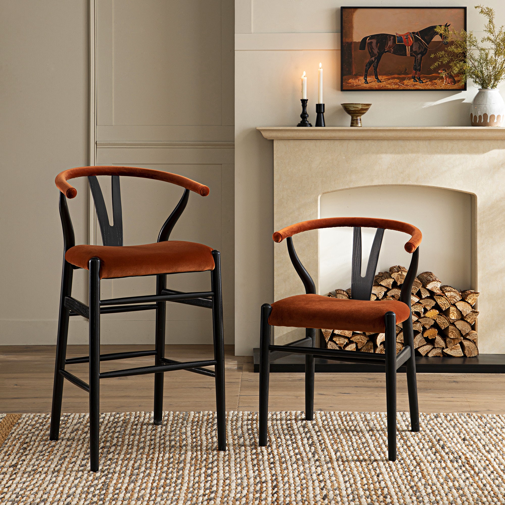 - Upholstered in sumptuous rust velvet, the chair is sturdily crafted from solid elm wood in black finish.