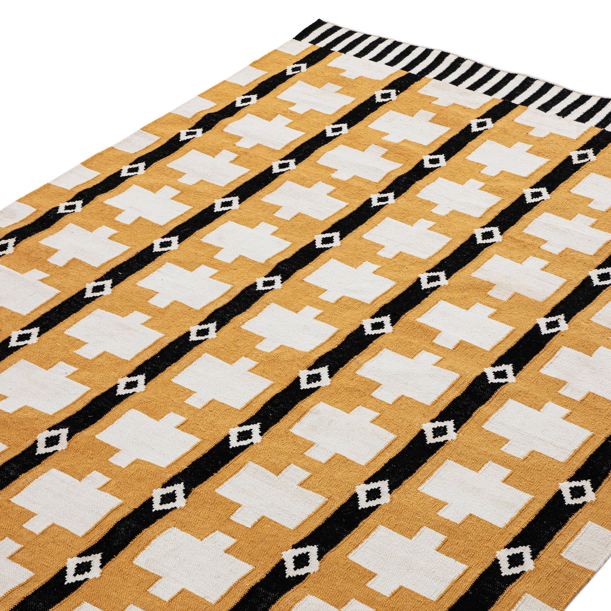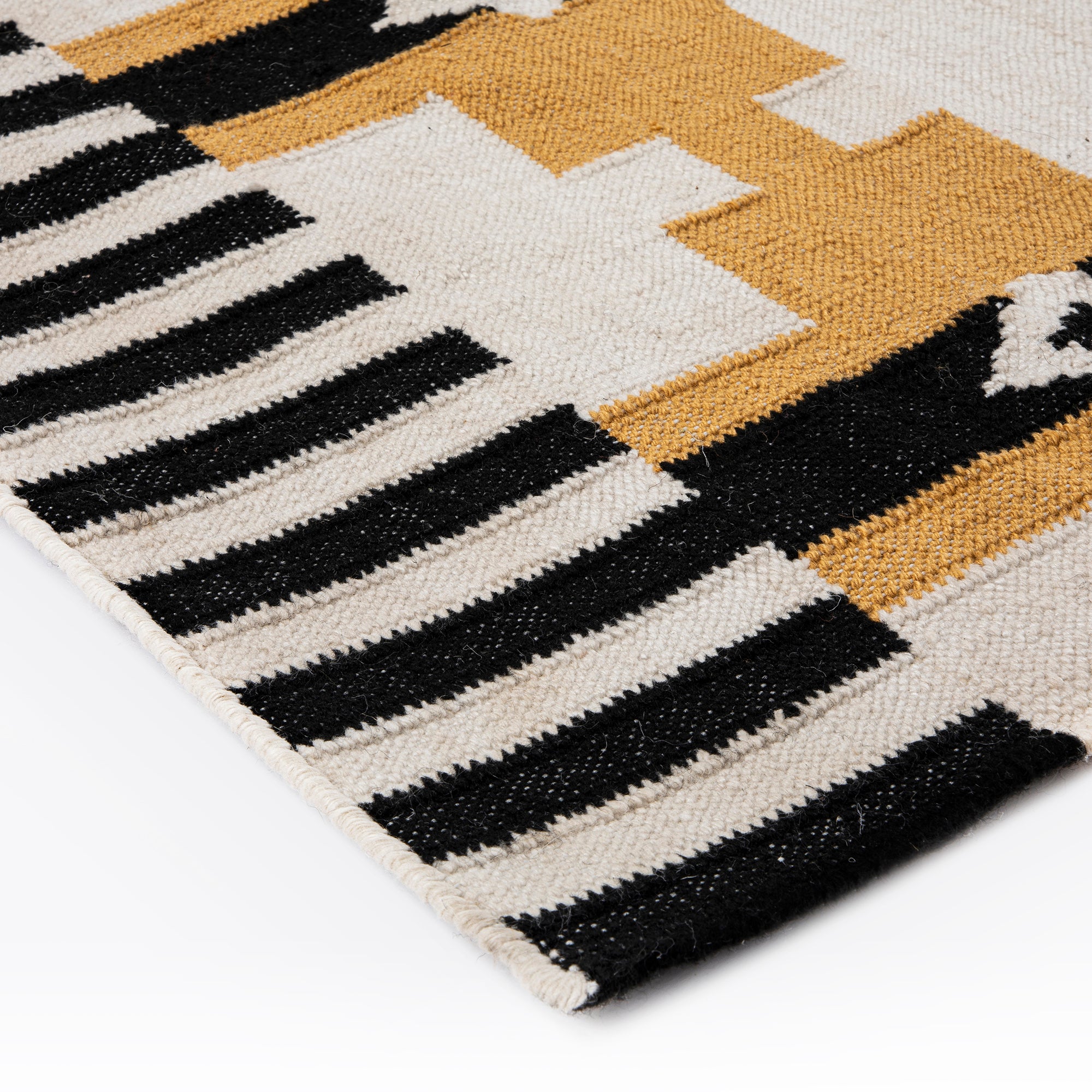 - This stylish rug has a unique design featuring repeat geometric motifs in striking yellow-orange, black and white, perfect for adding a touch of colour to any space.