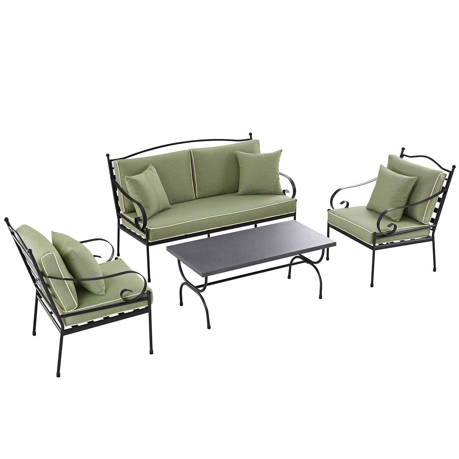 - Deep seat and back cushions provide supportive comfort, while the coordinating granite effect steel coffee table completes the set with a clean, practical centrepiece.