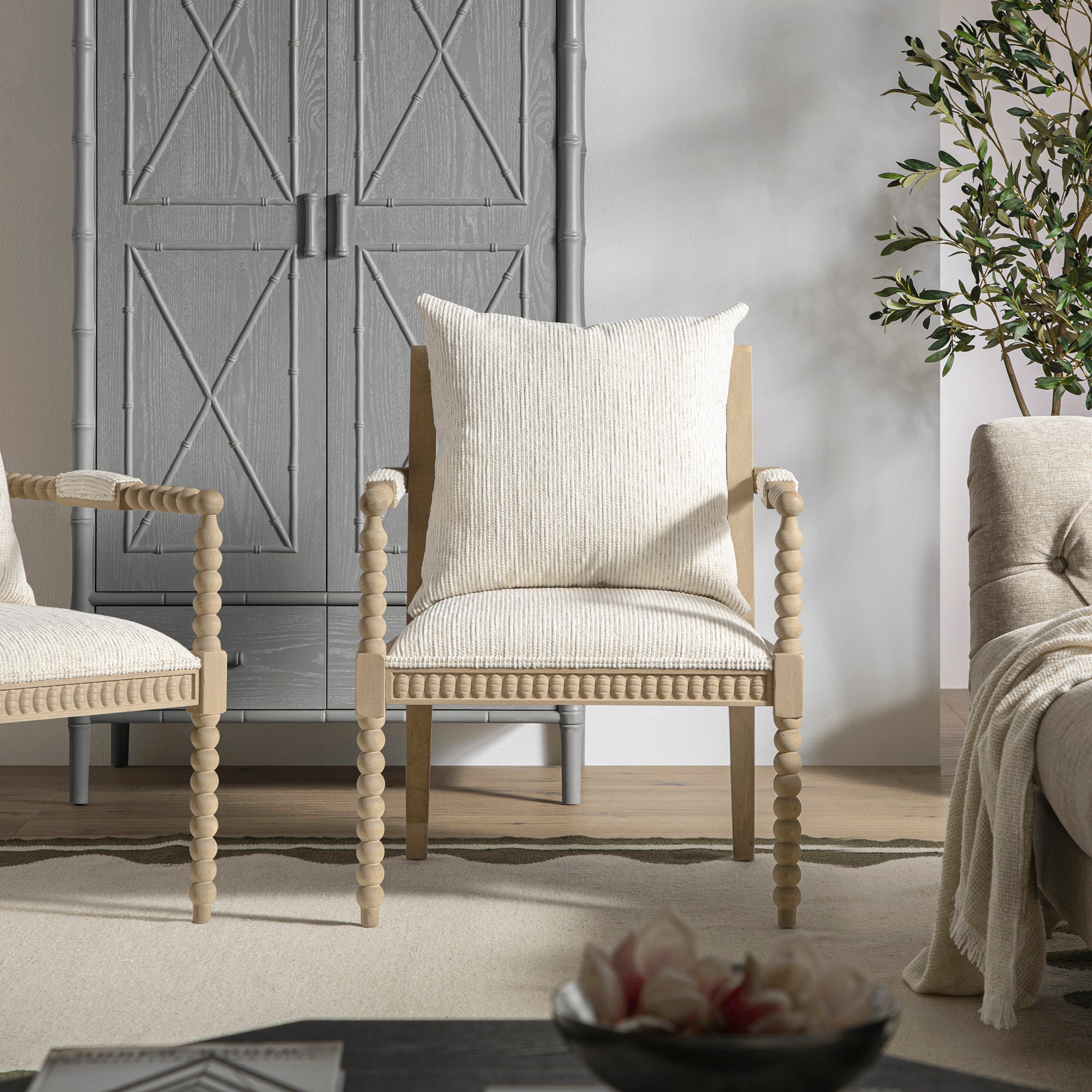 - Complete the look: Pictured with the Hemingford Beige Textured Fabric Bobbin Washed Oak Armchair, is our Elstowe Faux Bamboo Double Wardrobe, Warm Grey, and Matilda Olive Green Scallop Border Handwoven Wool Rug.