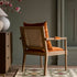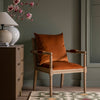 - The chair has padded seat and removable back cushion upholstered in beautiful rust velvet touch fabric, complimented with matching patches on armrests.