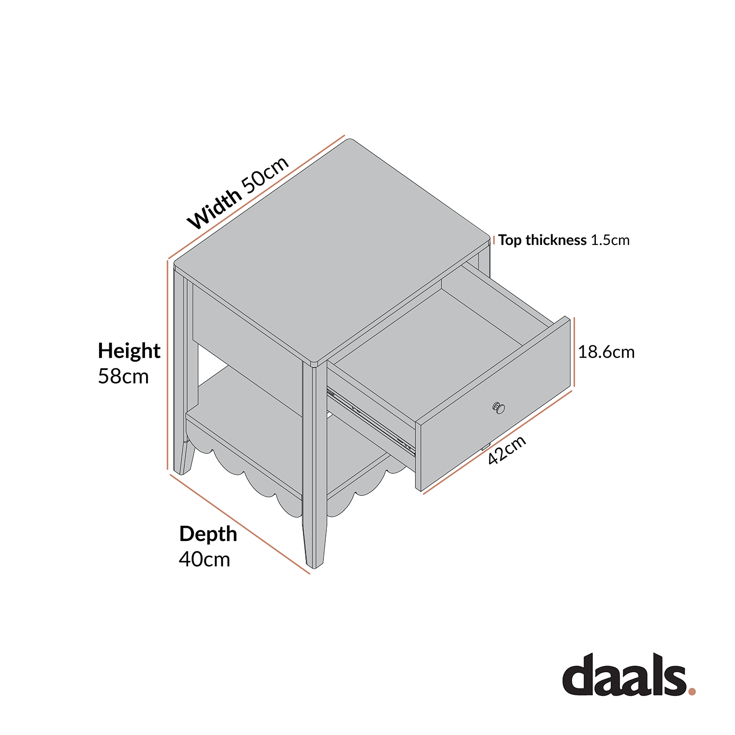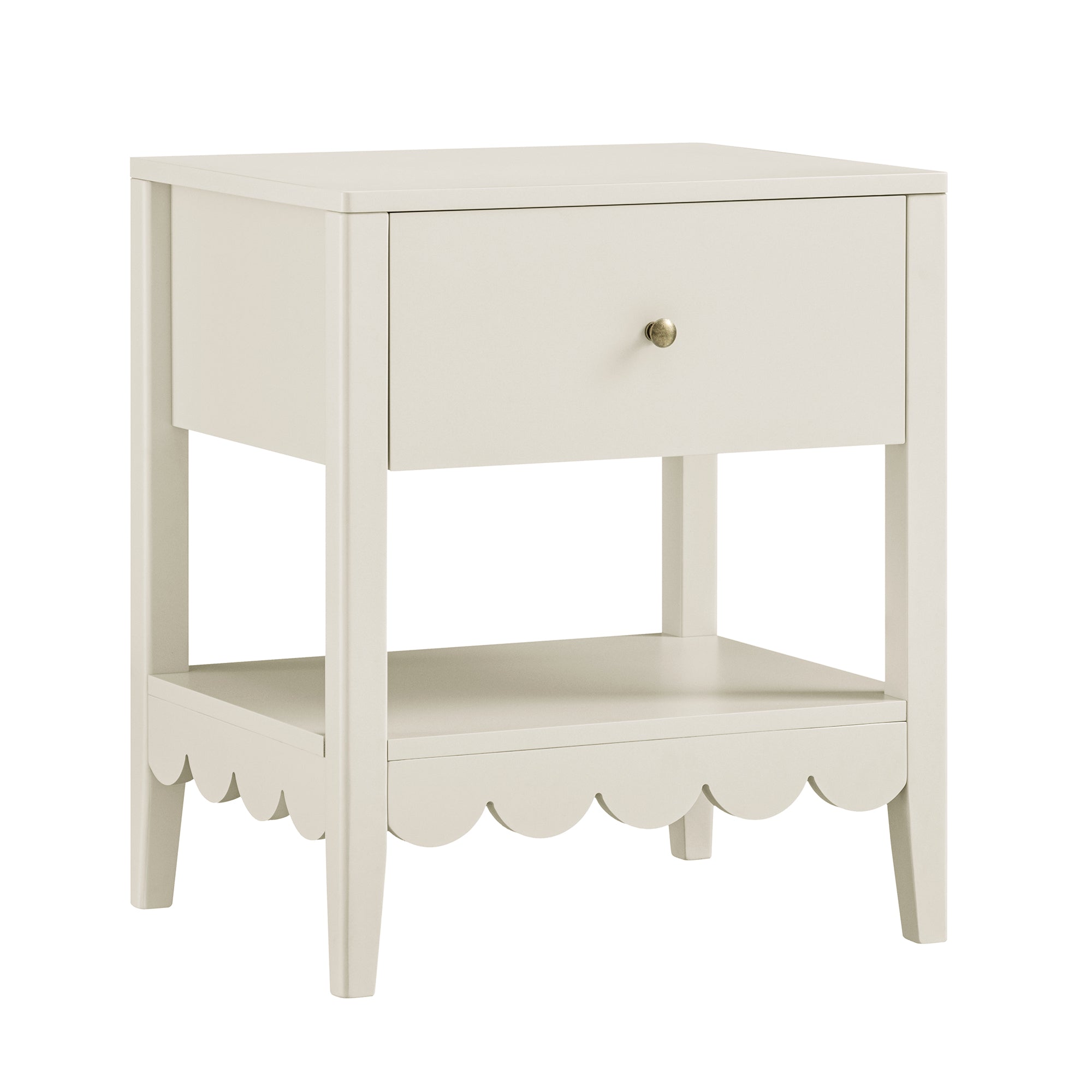 - Complete the look: Pictured with the Henley Light Sand Scalloped Edge Bedside Table is our Margot Taupe Embroidered Scallop Duvet Set, Hotel Collection Ivory 600TC Cotton Sateen Deep Fitted Sheet, Chilworth Ivory Upholstered Ottoman Storage Bed, Eliza Scarlet Red Striped Ruffle Linen Blend Cushion and Cambria Wool & Jute Handwoven Patterned Rug.