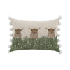 - The cushion features three charming highland cows in a meadow that have been embroidered in Cotton, beautifully complementing the neutral cream background, with fluffy white pom poms finishing off the look.