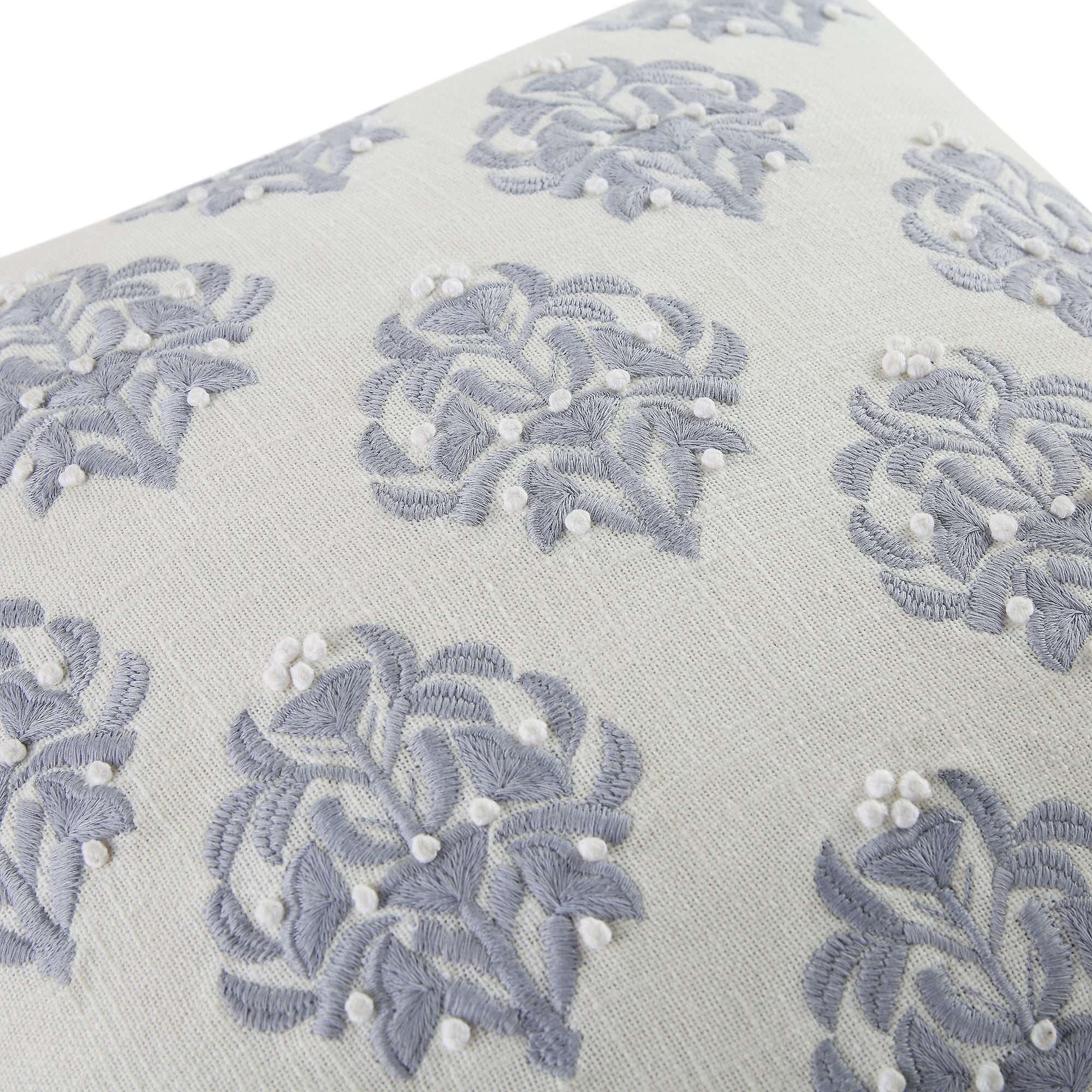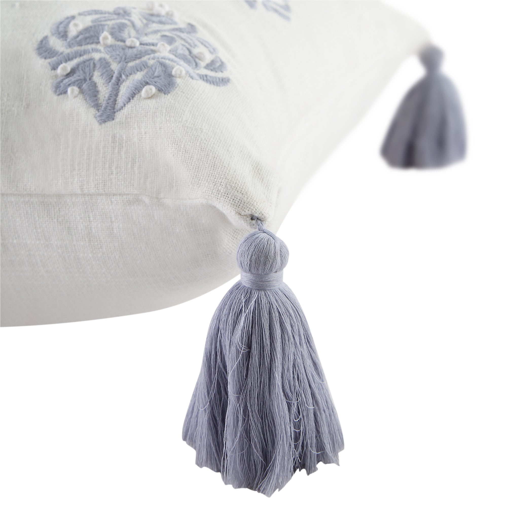 - Featuring handmade French knots in white and soft blue hues against a crisp white Cotton duck base, this cushion has a lovely style and texture.