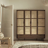 - Designed for those who need more storage without sacrificing style, the Izzy Curved Rattan 4-Door Wardrobe in Walnut makes a statement with its dark walnut effect finish and airy handwoven rattan panels.