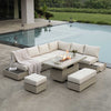 - Comprising of a solid aluminium frame and sumptuous back and seat cushions for added comfort and support, our Jardin Large Corner Casual Dining Set with Rising Firepit Table is perfect for summer garden parties