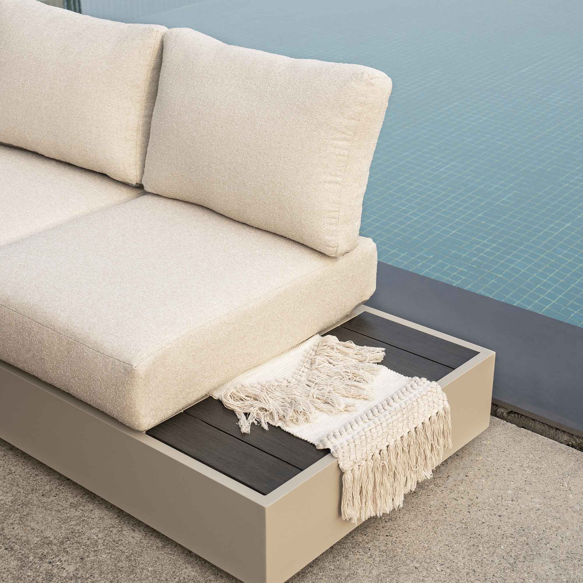 - Amply padded back and seat cushions are upholstered with UV resistant and water proof beige boucle fabric, coordinating the pumice frame to create a soft yet sophisticated appearance