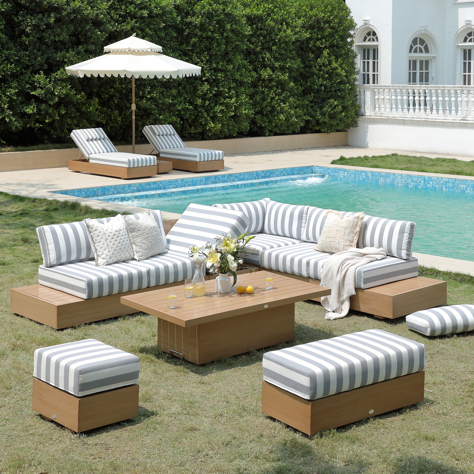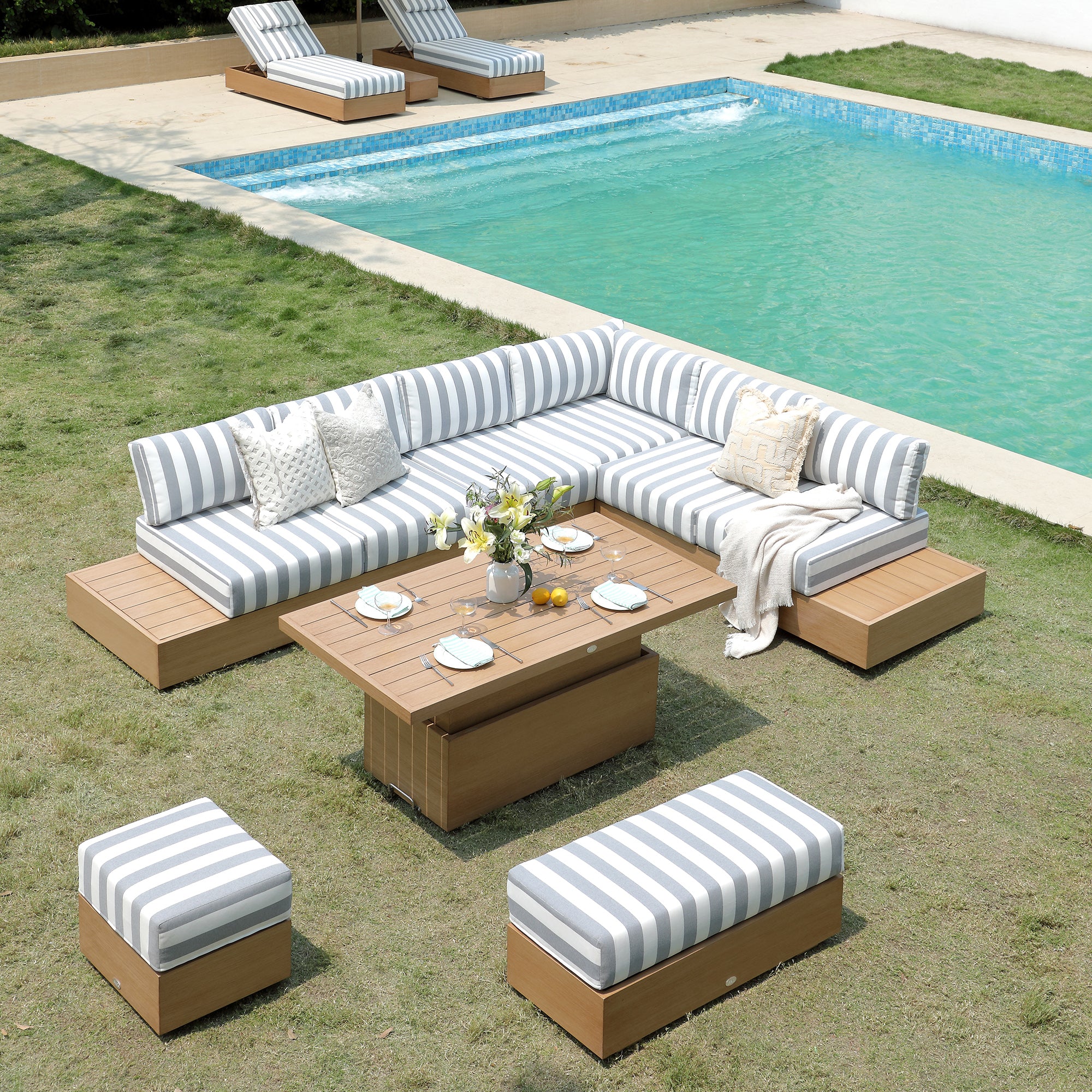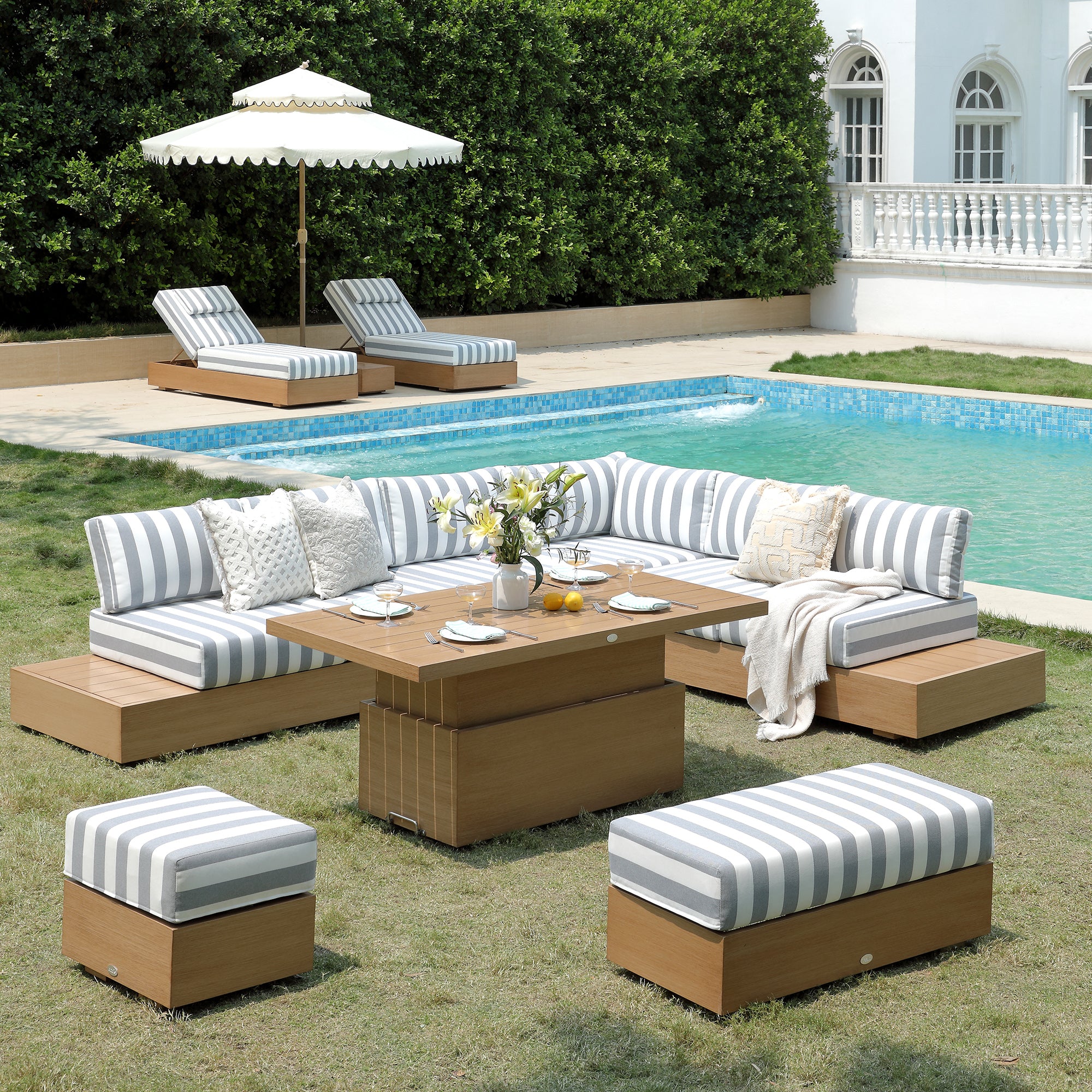 Jardin Aluminium Large Corner Casual Dining Set with Rising Table, Natural with Blue Stripes