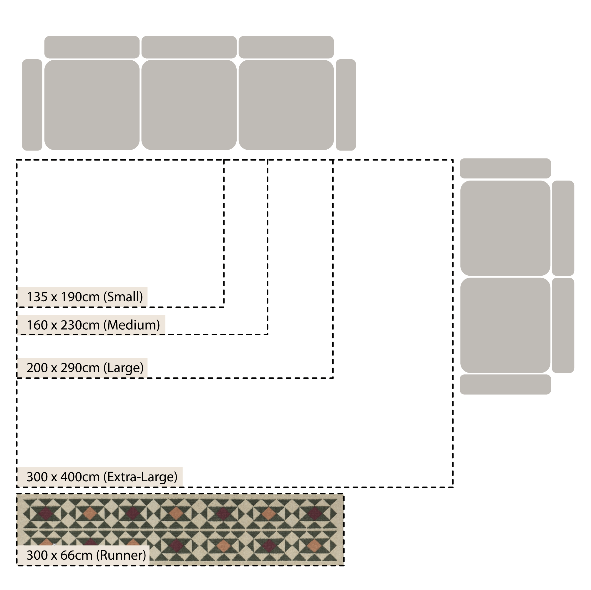 - This stylish runner features a striking repeat geometric pattern in shades of olive green, ochre and deep maroon red which is perfectly complimented by the neutral cream background.