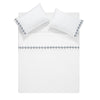 - An embroidered navy and powder blue circular floral repeat pattern of tulips and swirling vines adorns the borders of the duvet set, its refined detail, heritage craftsmanship and texture brings a feeling of sophistication and understated luxury. The classic white colour is easy to pair with any décor style, from modern minimalism to traditional elegance.