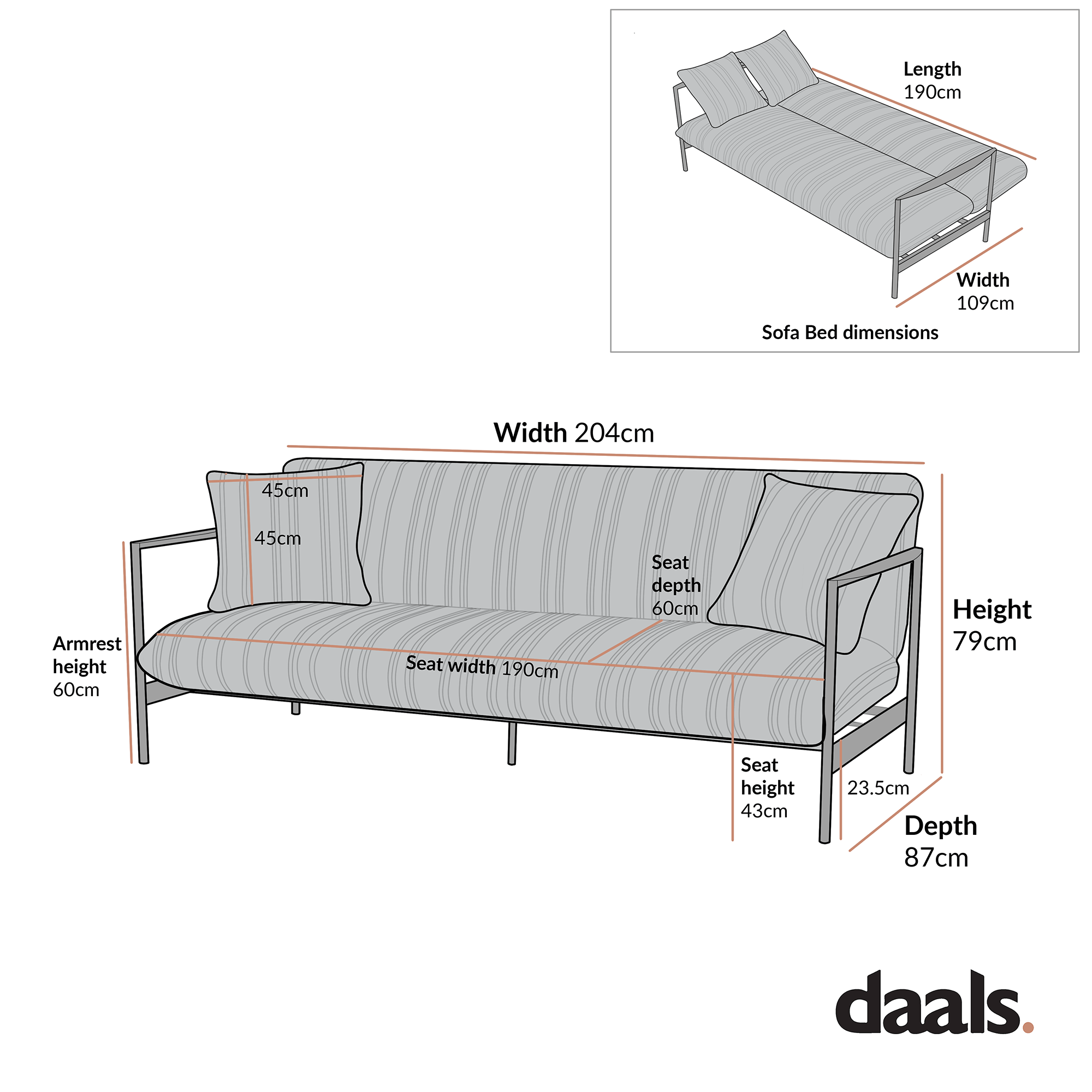 Linea Three Seater Sofa Bed, Taupe Striped Chenille