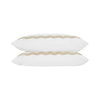 - A wavy natural linen appliqué border adds both visual interest and texture to the Lucinda's crisp white base, creating a playful but refined look. The appliqué is neatly finished with a satin stitch edge that adds just a hint of lustre, providing contrast against the matte percale and textural linen.