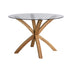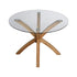 - Featuring four subtly curved chunky solid wooden legs that cross in an eye-catching cluster design, the clear tempered glass top lends your dining space transparency and light.