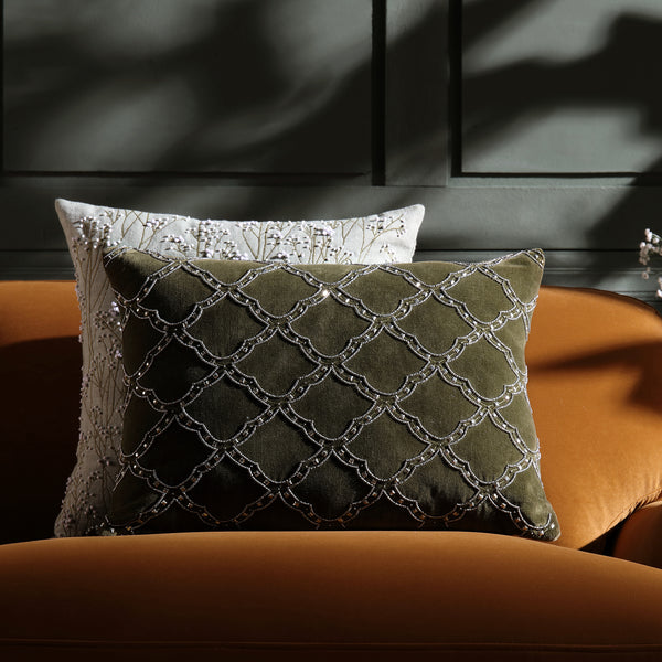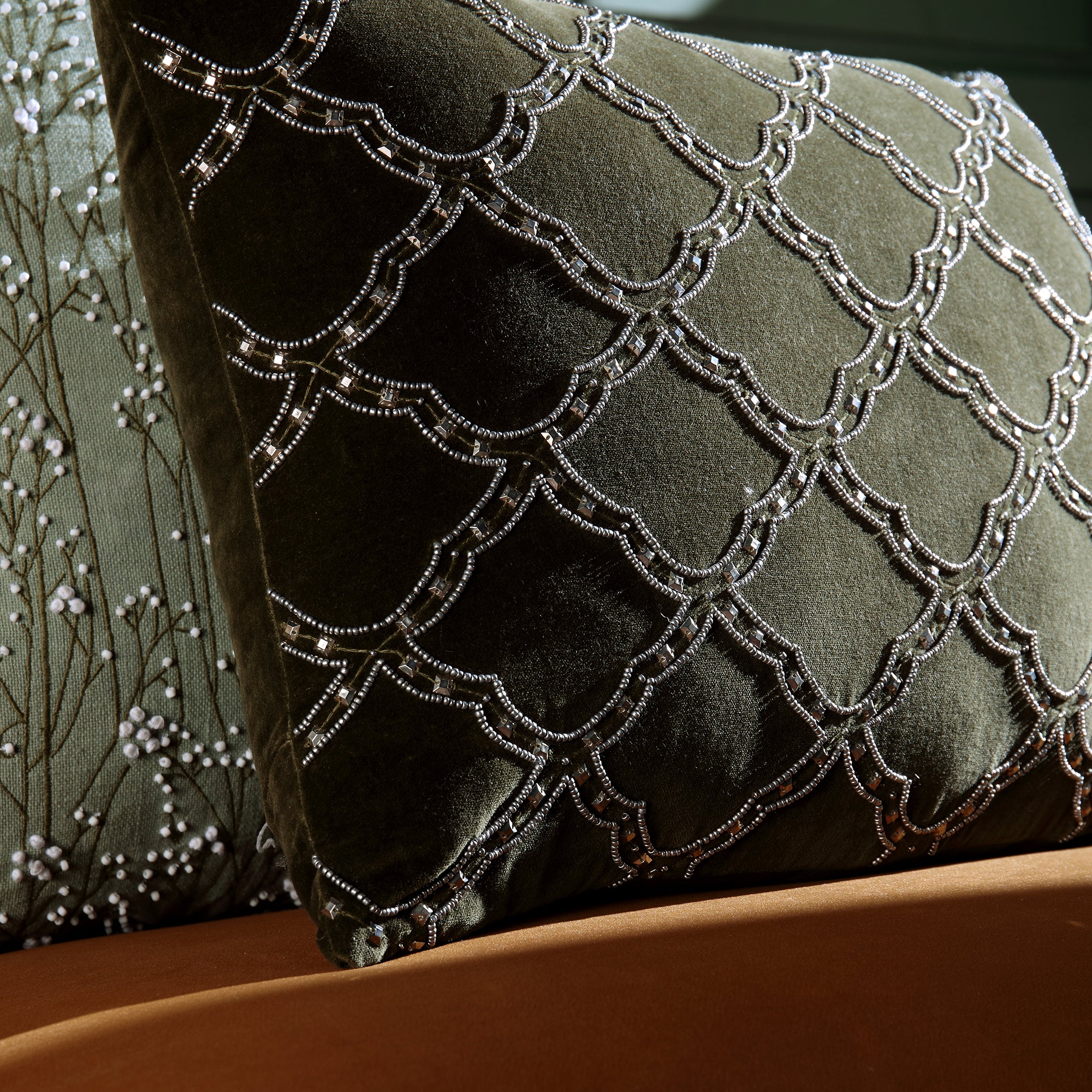 - Complete the look: Pictured with our Luxe Collection Greta Moss Green Cushion is our Daphnis Cinnamon Velvet Sofa and Meadow Hand Beaded and Embroidered Sage Green Cushion.
