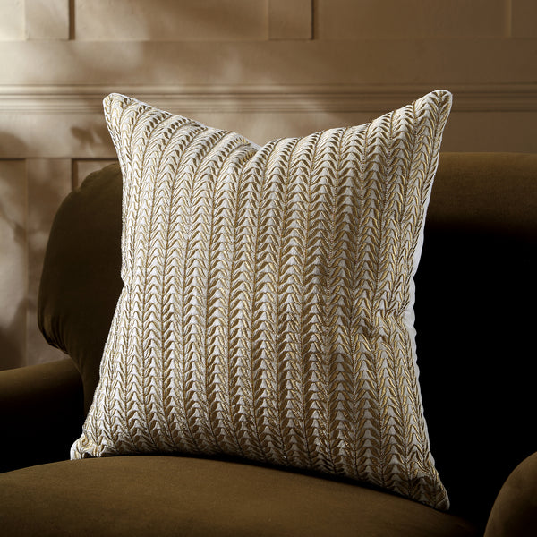 - The Jasmine cushion has been made from sumptuous pearl white cotton velvet and beautifully adorned with golden beads and embroidered leaf detail, making it the perfect solution for glam décor.