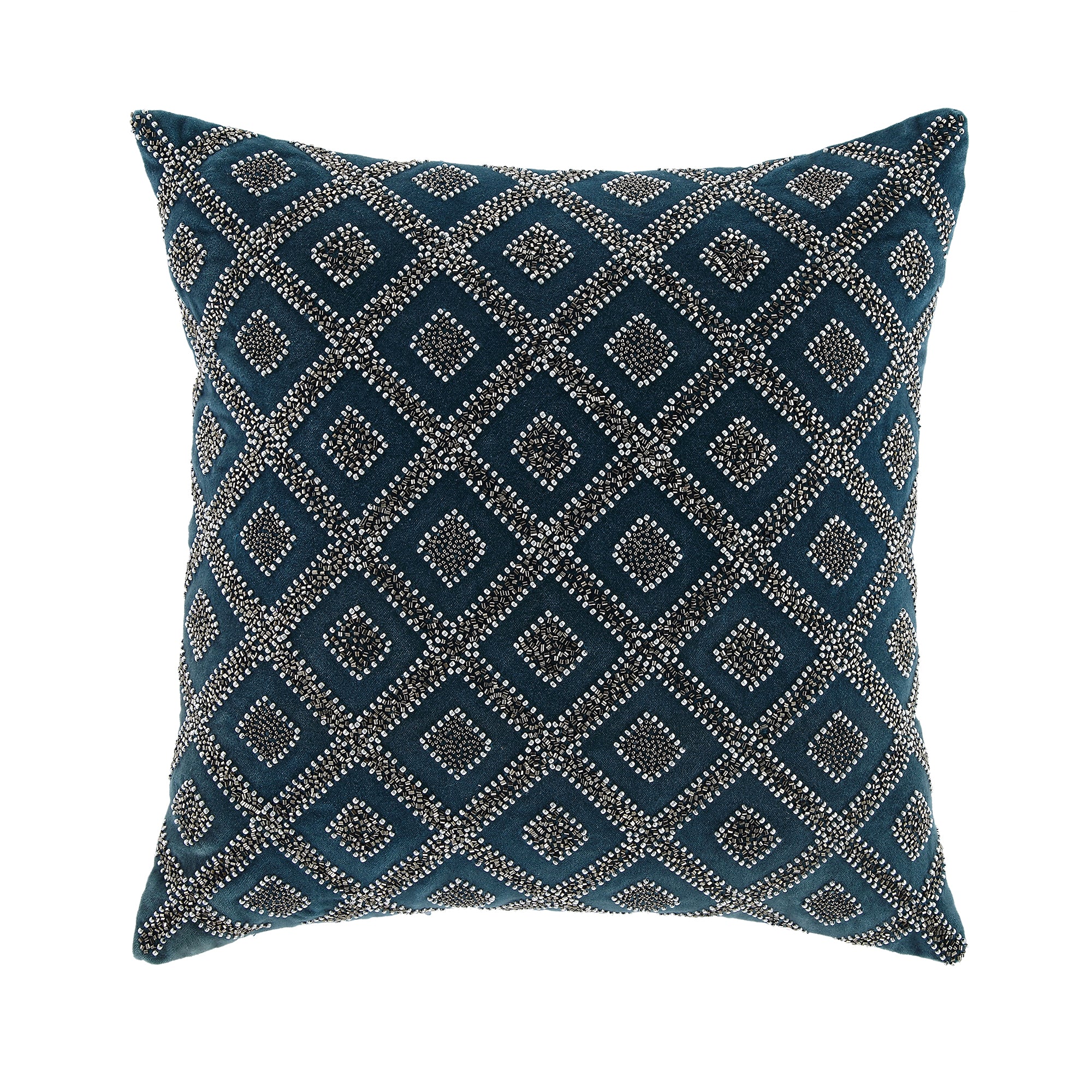 - Made from sumptuous teal blue Velvet and beautifully adorned with silver metallic beads, this cushion is the perfect solution for Glam décor.