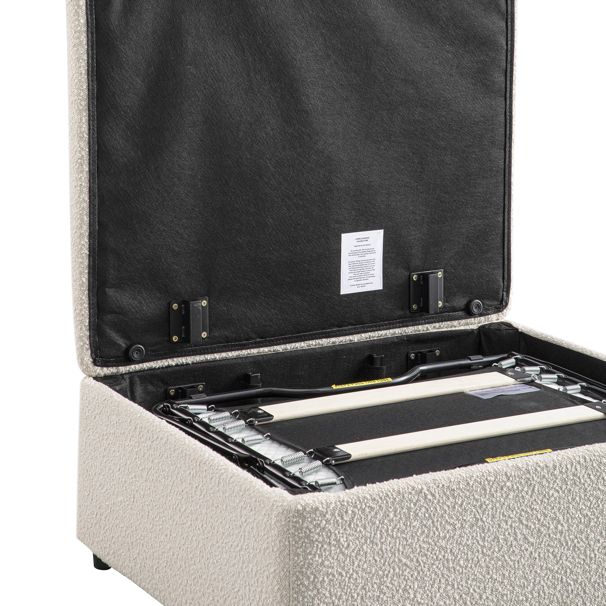 - Designed with ease and elegance in mind, the compact silhouette doubles as a chic ottoman by day, upholstered in a cosy beige boucle fabric that adds texture and warmth to any room.