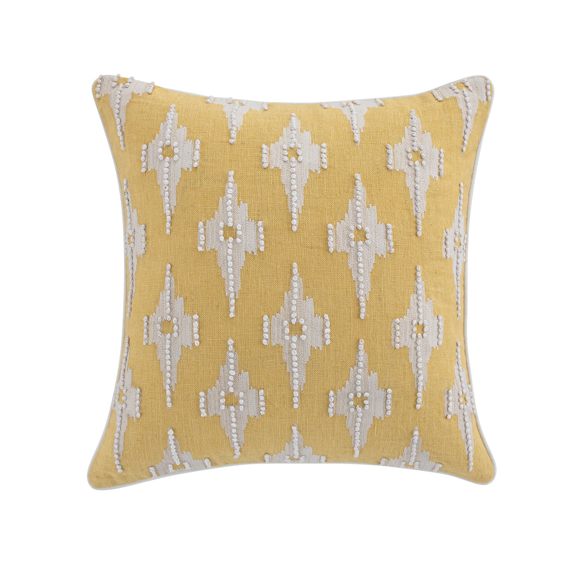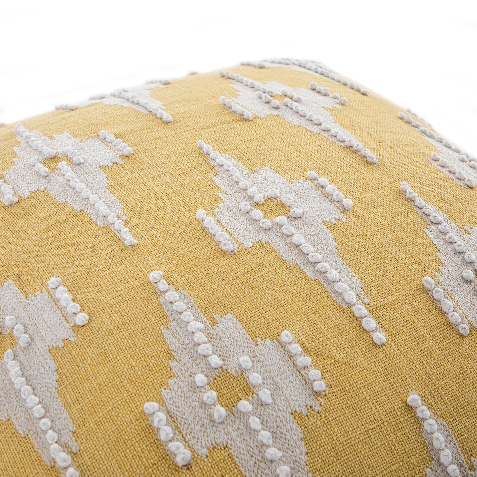 - Complete the look: Pictured with the Mahika Ikat Yellow French Knot Linen Cushion is our Daphnis Blue Striped Linen Blend Loveseat Sofa and Oakham Rattan Yellow Chest of 4 Drawers.