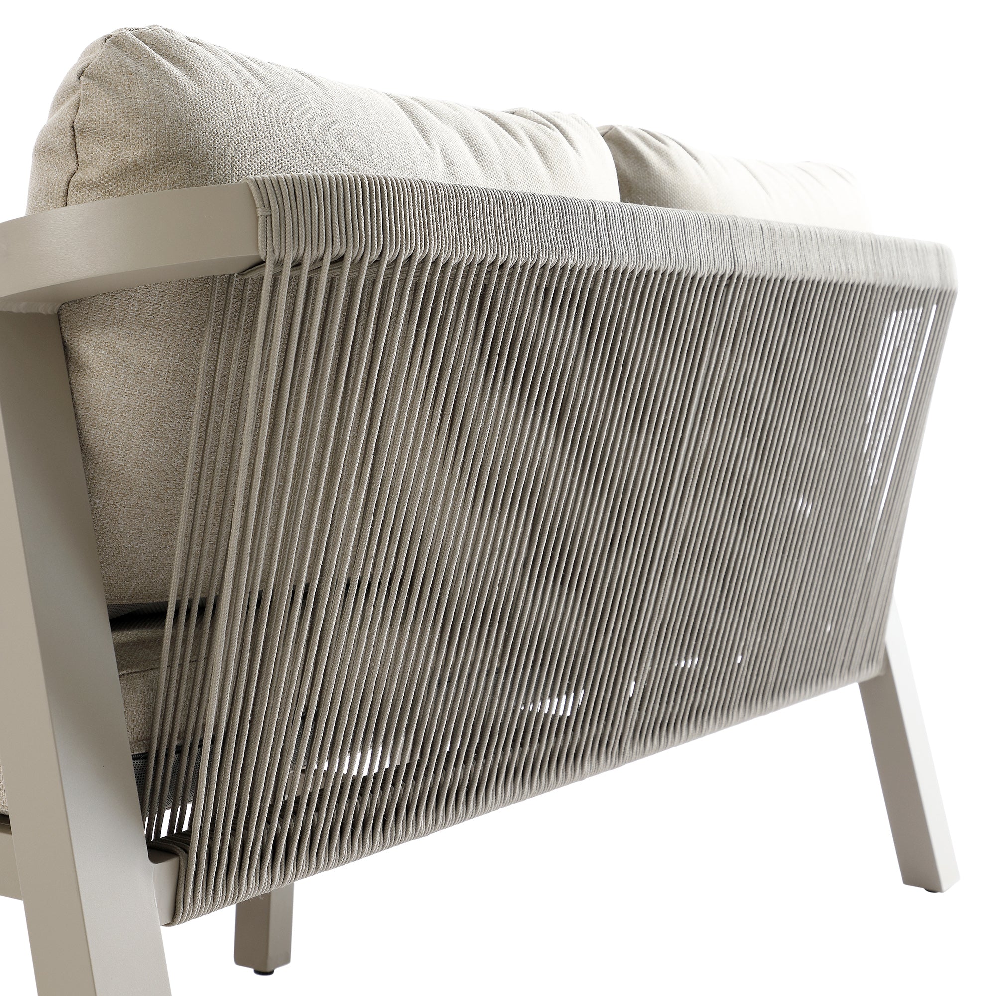 - Designed with full aluminium frame powder-coated in an elegant taupe finish, this set brings gentle curves and refined simplicity to any terrace, garden, or patio space.