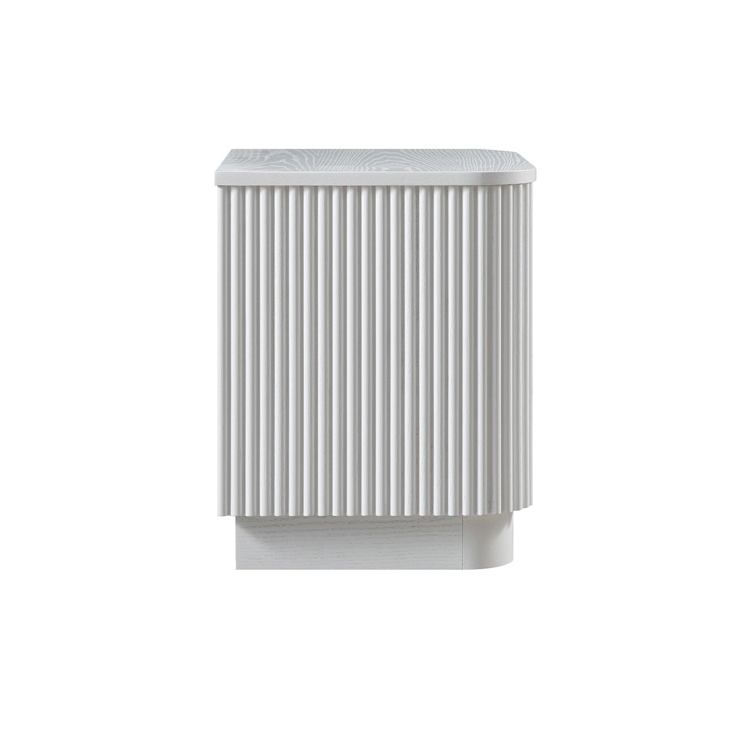 - With its softly rounded silhouette, vertical fluted detail, and open shelf design, the Maru 1-Drawer Bedside Table in Washed White brings a calm, sculptural presence to your bedroom.