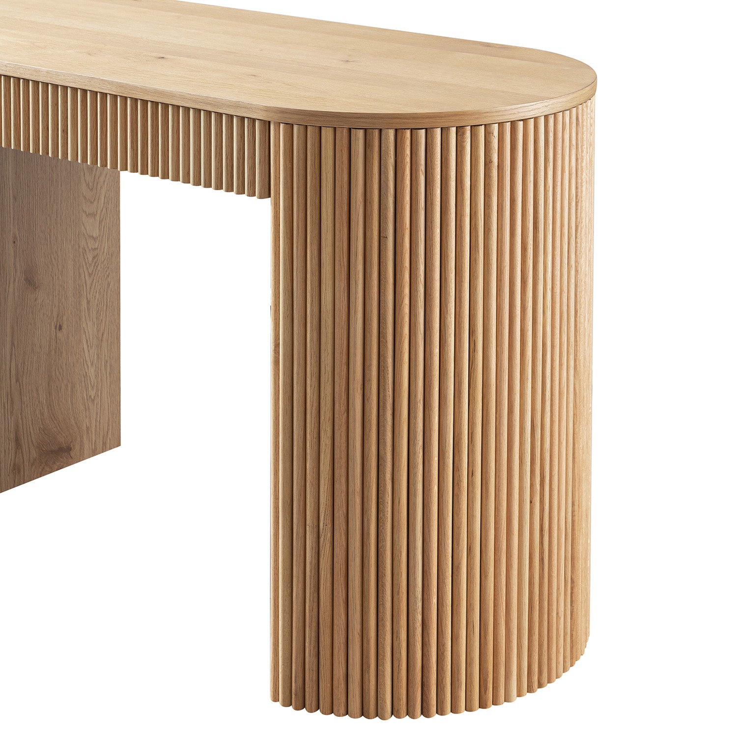 - Its softened oval top and gently rounded pedestal legs are wrapped in solid oak reeds, creating a rhythmic fluted profile that’s as calming as it is striking.
