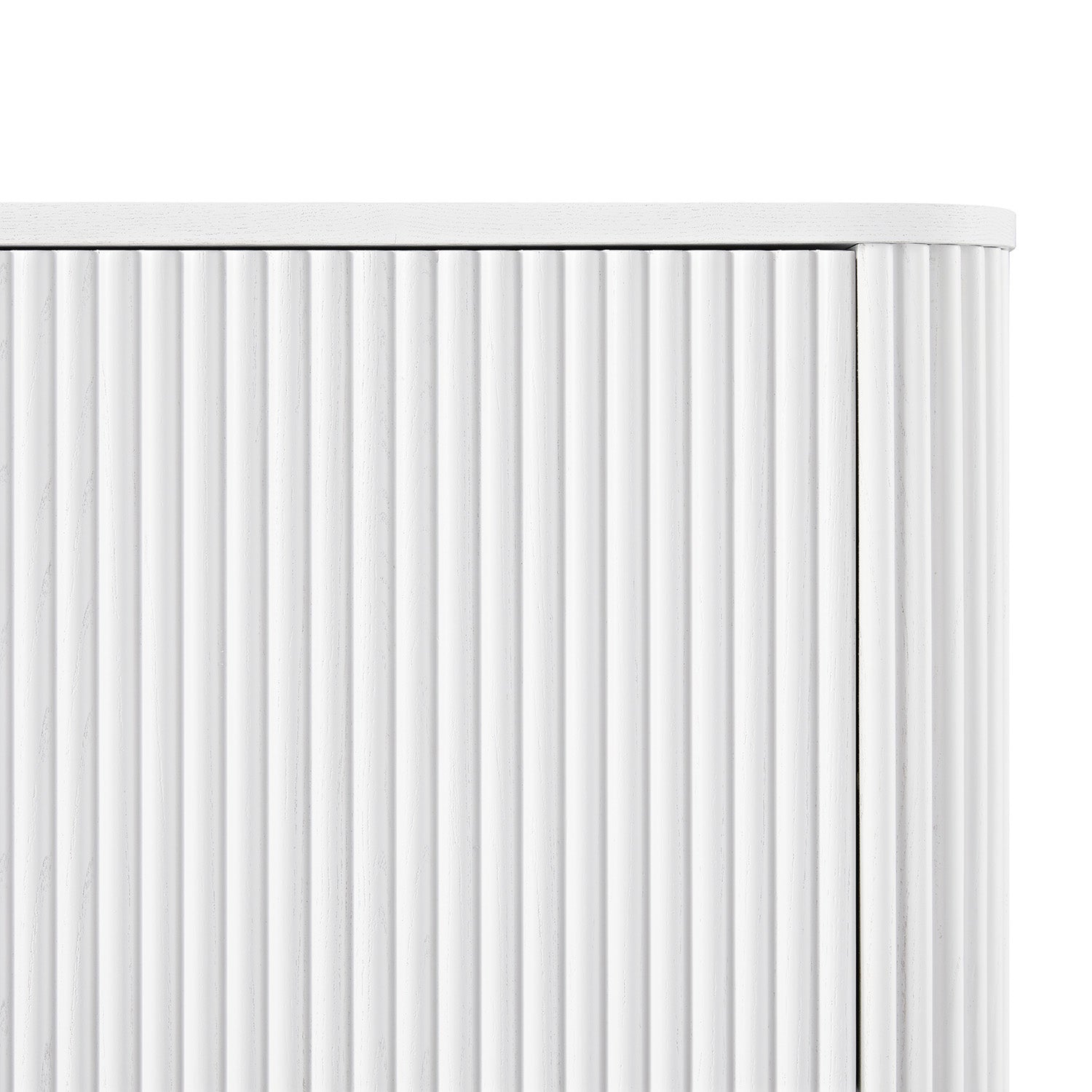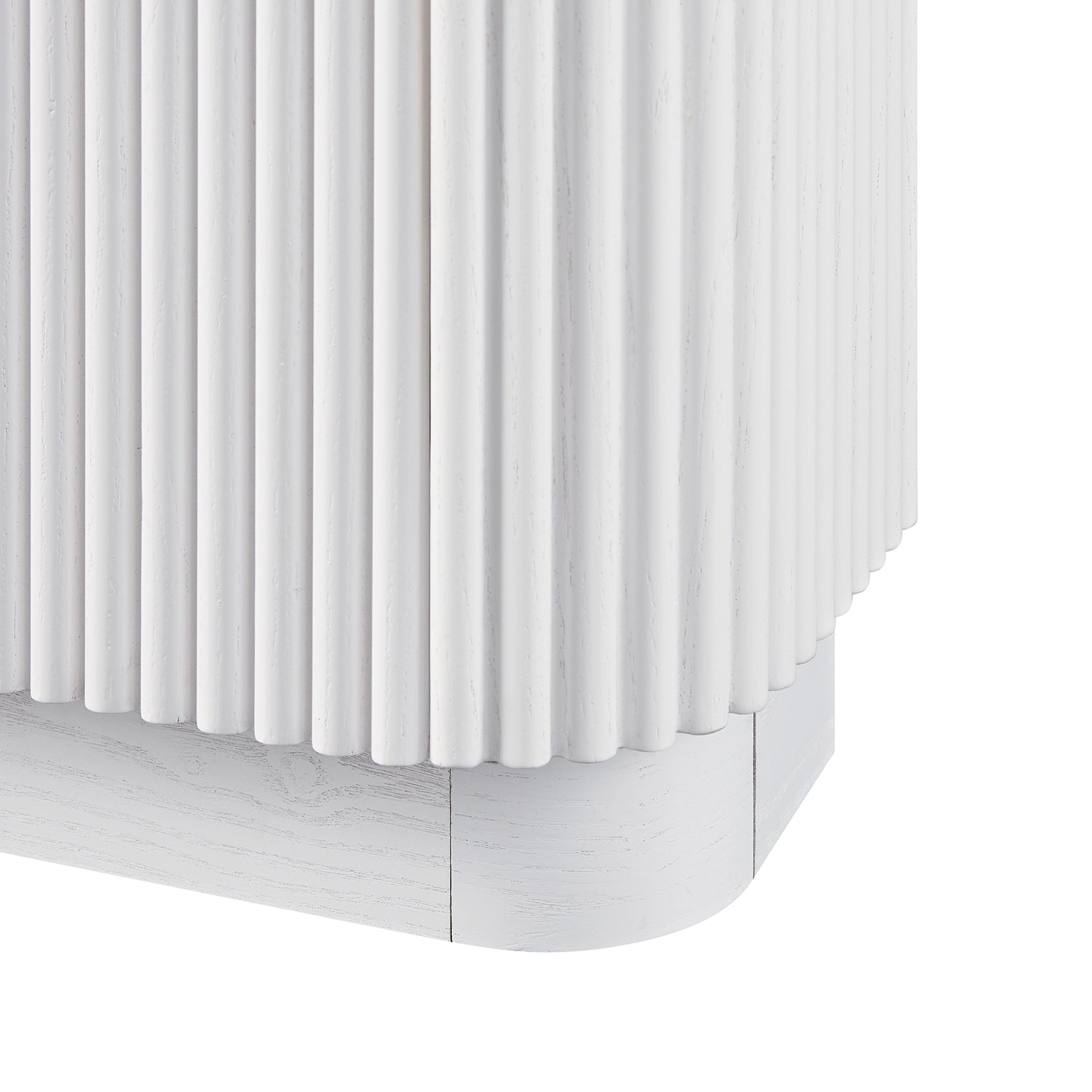 - The fluted solid ash and ash veneer front creates subtle rhythm and texture, beautifully finished in a soft, whitewashed tone that reveals the natural wood grain beneath.