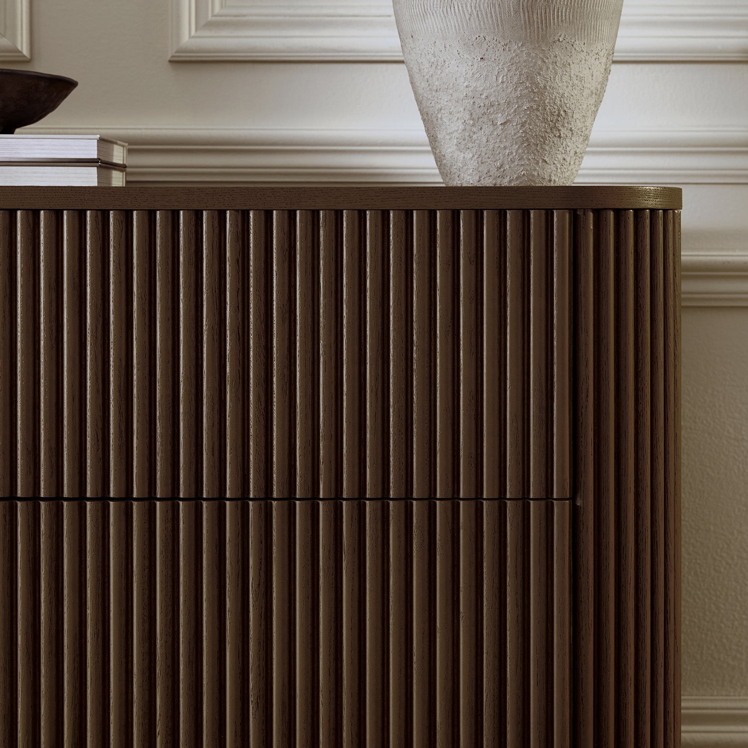 - The chest is designed with all solid ash flutes on 3 vertical surfaces, including the front and both sides, for a well-rounded look.