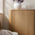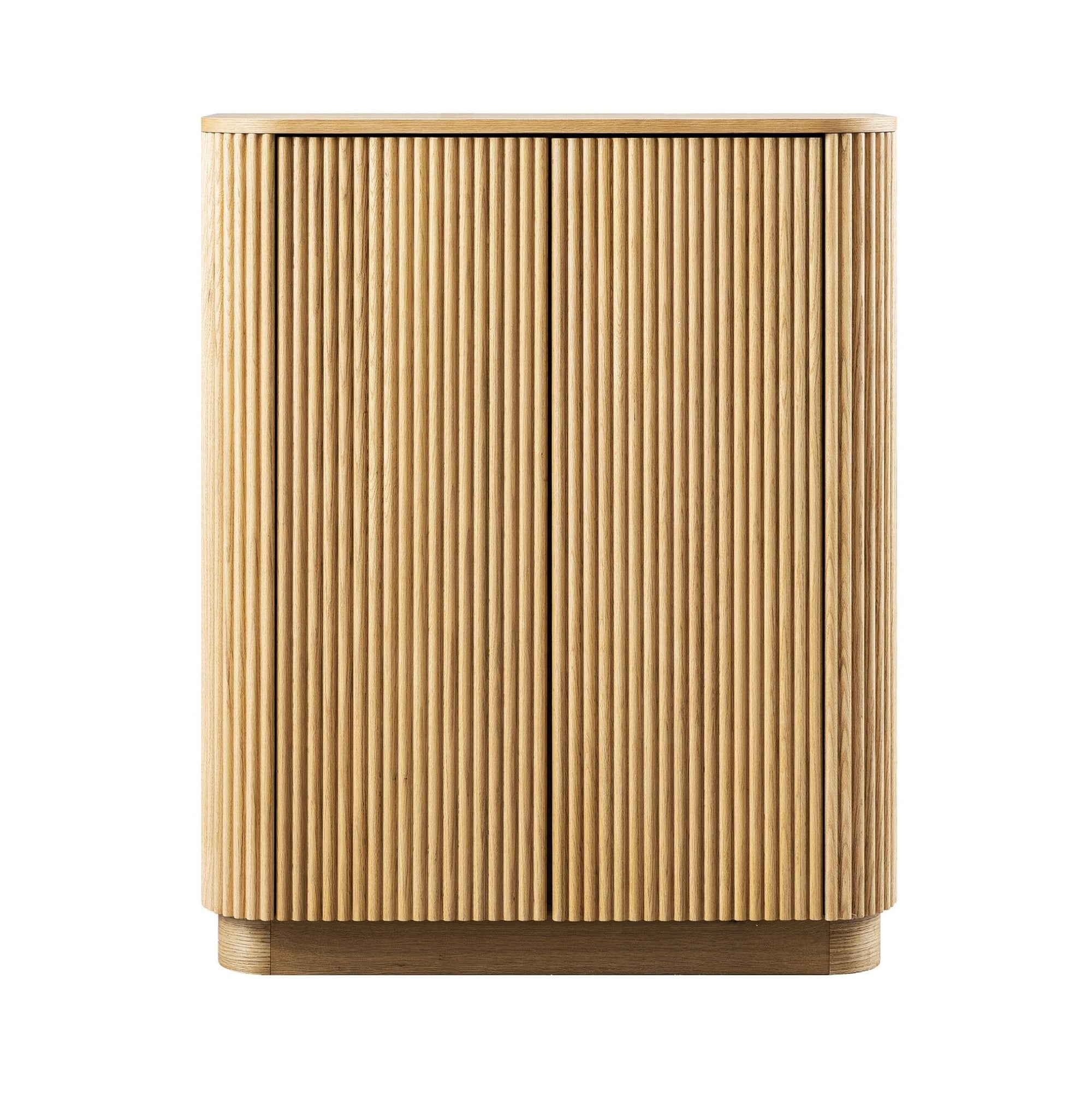 • Crafted in solid oak and veneer, the cabinet's vertical fluting and gently curved corners echo the signature Maru collection design language: inviting texture, warmth, and visual balance.