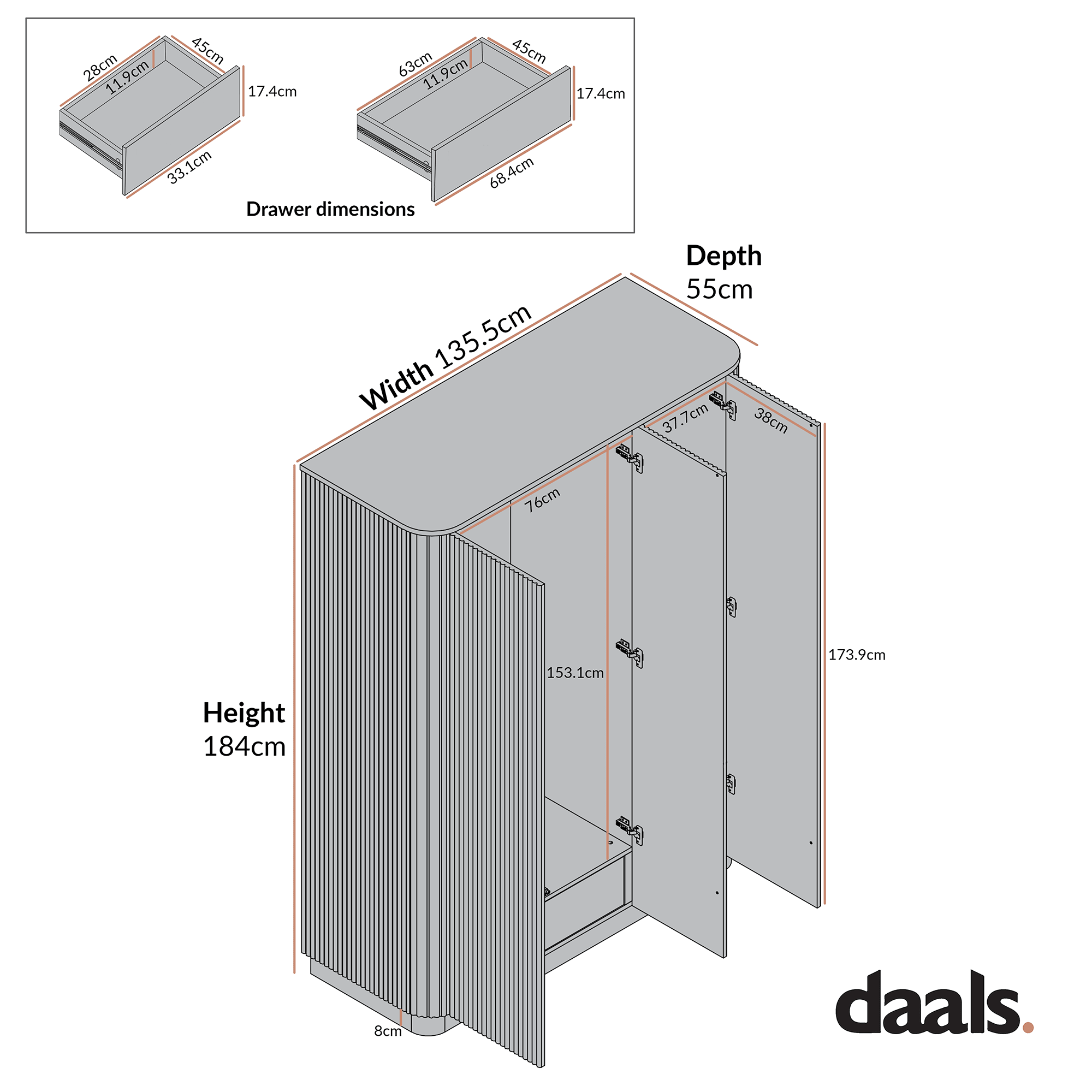 - Overall size: W 135.5 x D 55.0 x H 184.0 cm