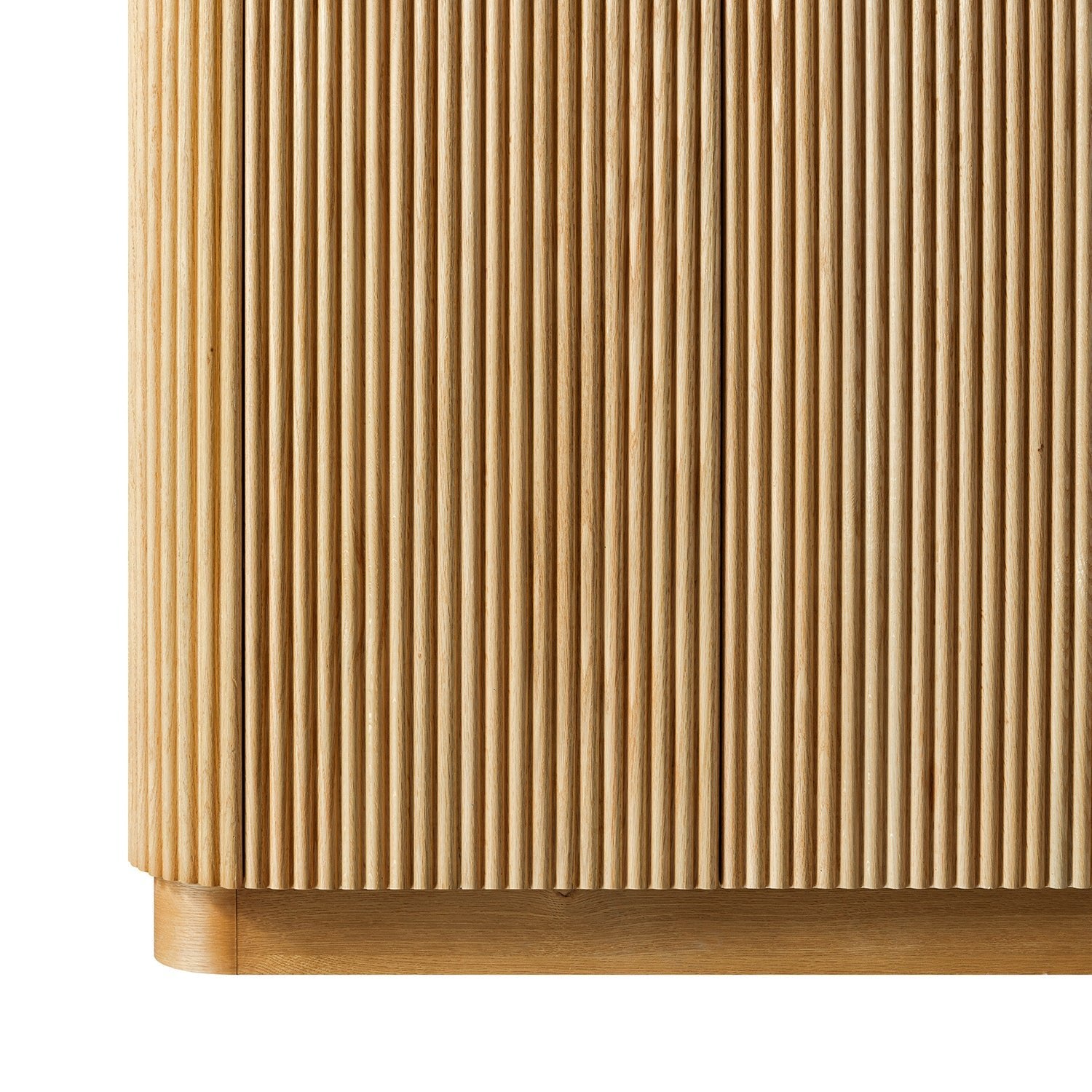 - Vertical fluting wraps the piece on front and both sides in subtle rhythm and texture, while the softly curved corners and recessed plinth base keep the profile grounded yet elegant.