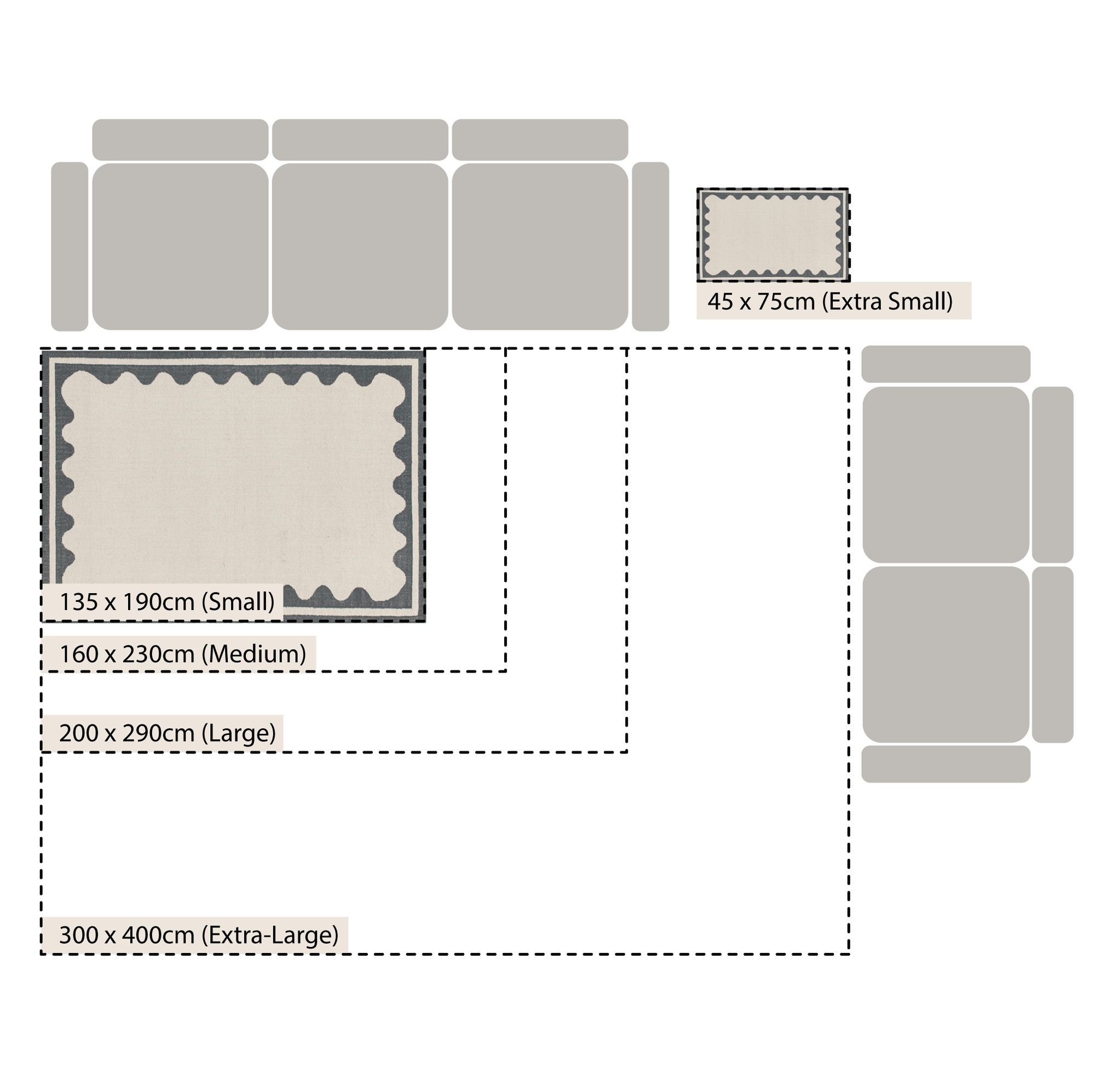 - This stylish cream rug is beautifully finished with a scallop blue border, perfect for framing a coffee table or adding a touch of colour to any space.