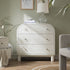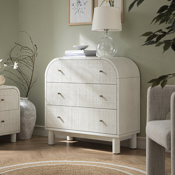 - Complete the look: Pictured with our Maude Chest of 3 Drawers is our Evie Hand Braided Jute Scallop Round Rug, our Greenwich Oatmeal & Beige Woven Textured Fabric Chair and our matching Maude 2 Drawer Bedside Table