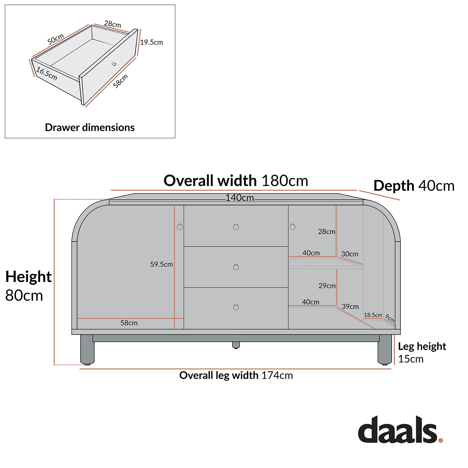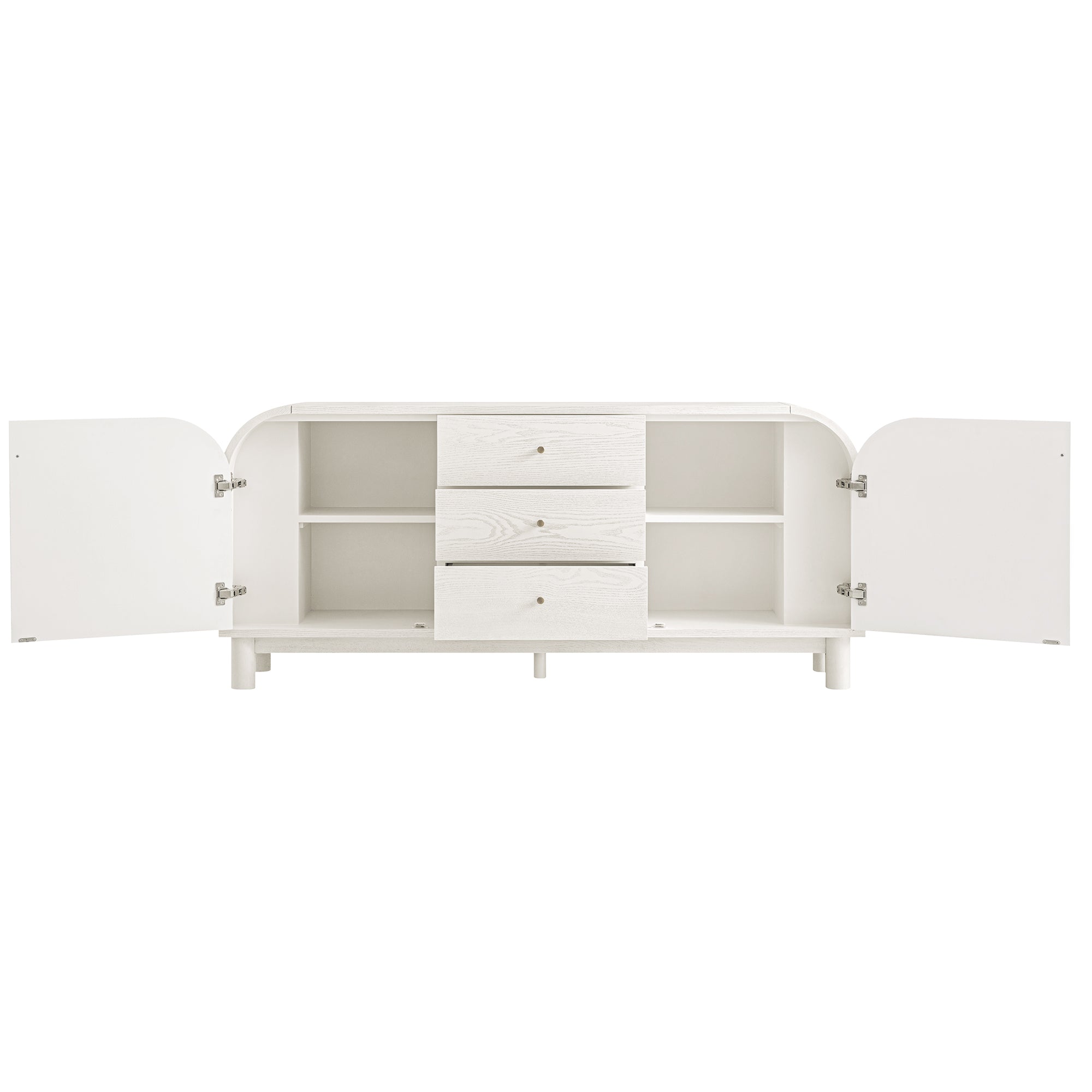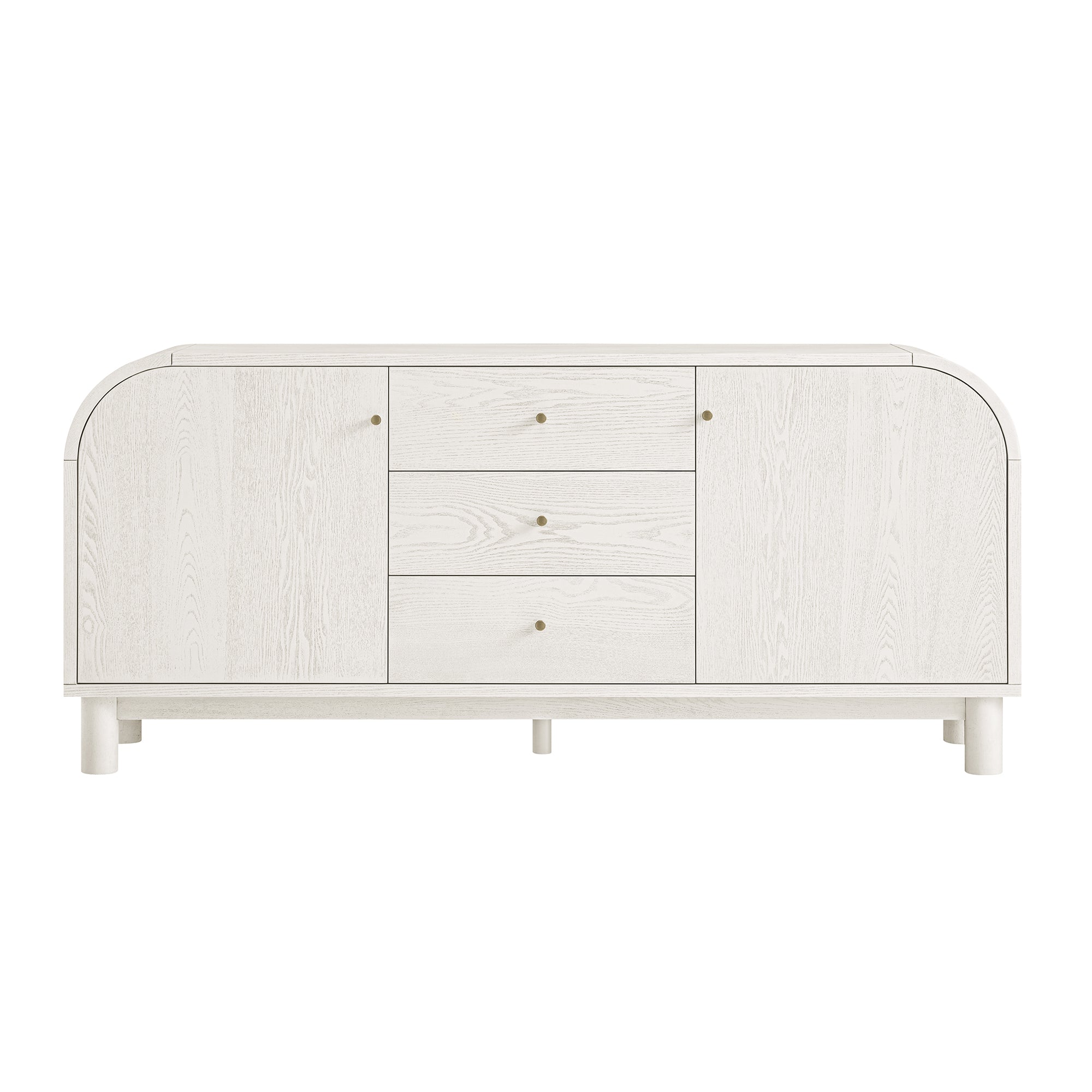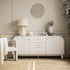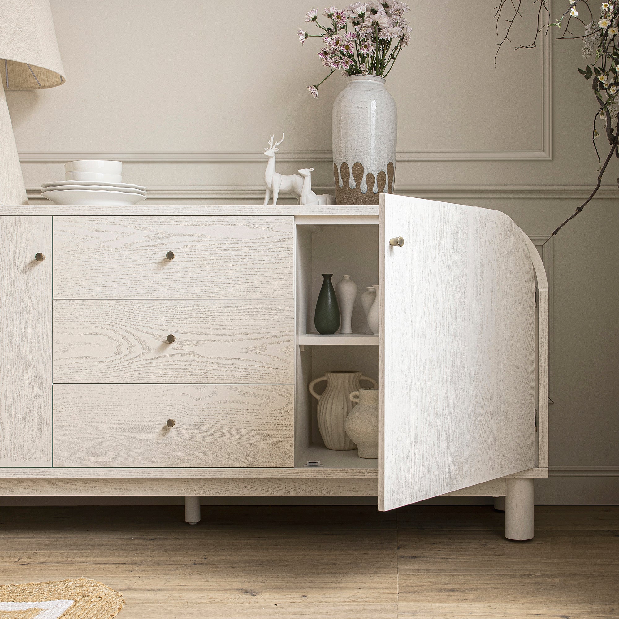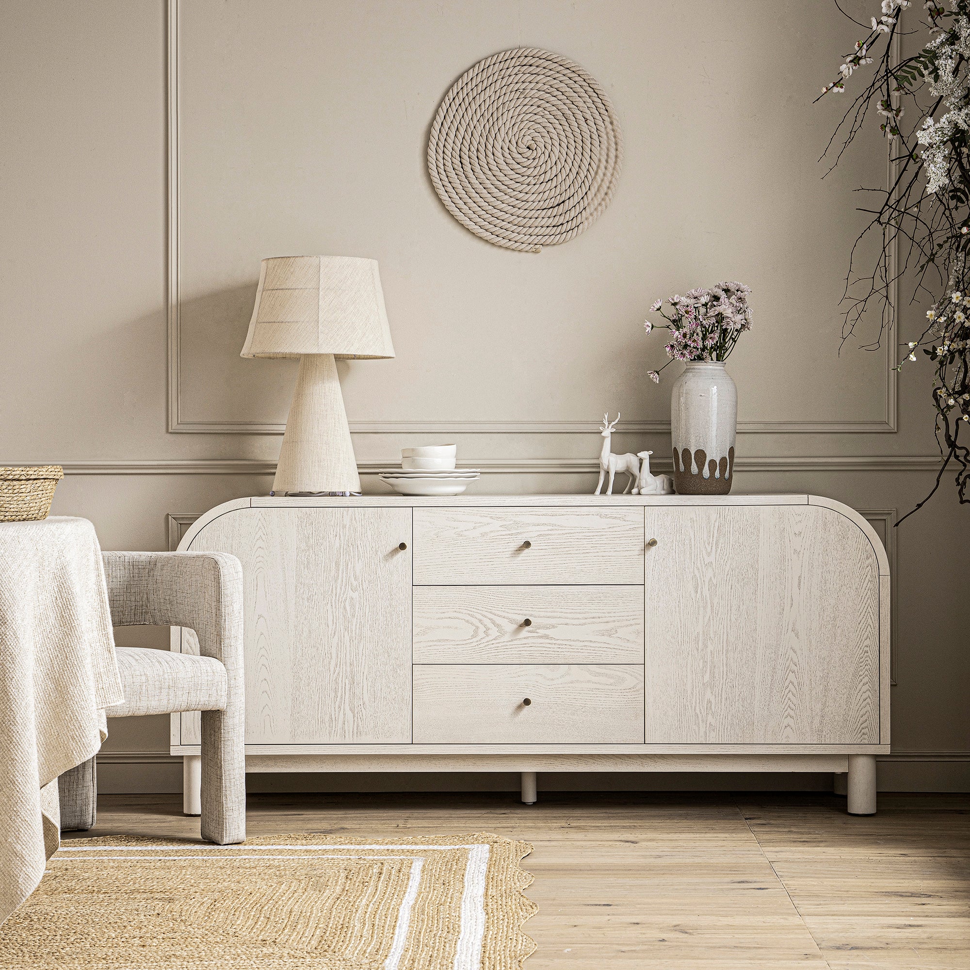 - Complete the look: Pictured with our Maude Wide 3-Drawer Sideboard is our Greenwich Chairs in Oatmeal and Beige Woven Textured Fabric and in Taupe Boucle and Beige Faux Leather and our Evie Hand Braided Jute Scallop Rug.